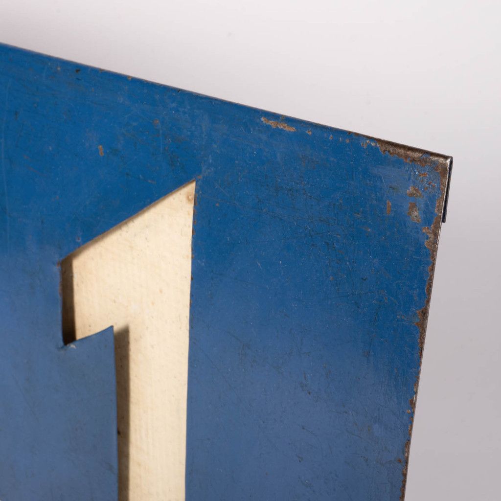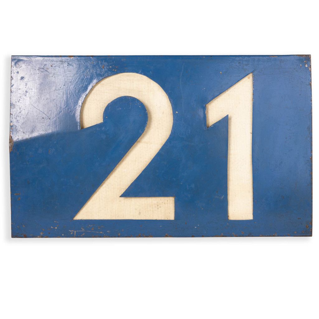 Původní cedule ze staré tramvajové linky č. 21 z 80. let. V modře lakované plechové desce s výřezem čísla je zasazena kontrastní světlá deska. Cedule je v dobrém původním stavu s výraznou patinou, která je vidět na fotografiích. Plech je mírně zvlněný a různě odřený.