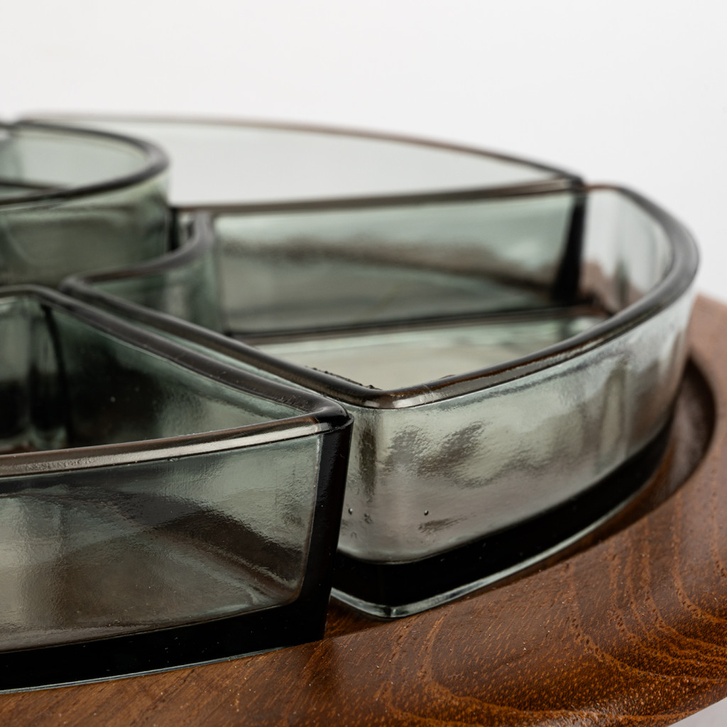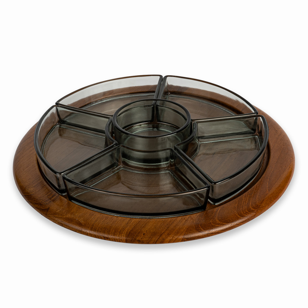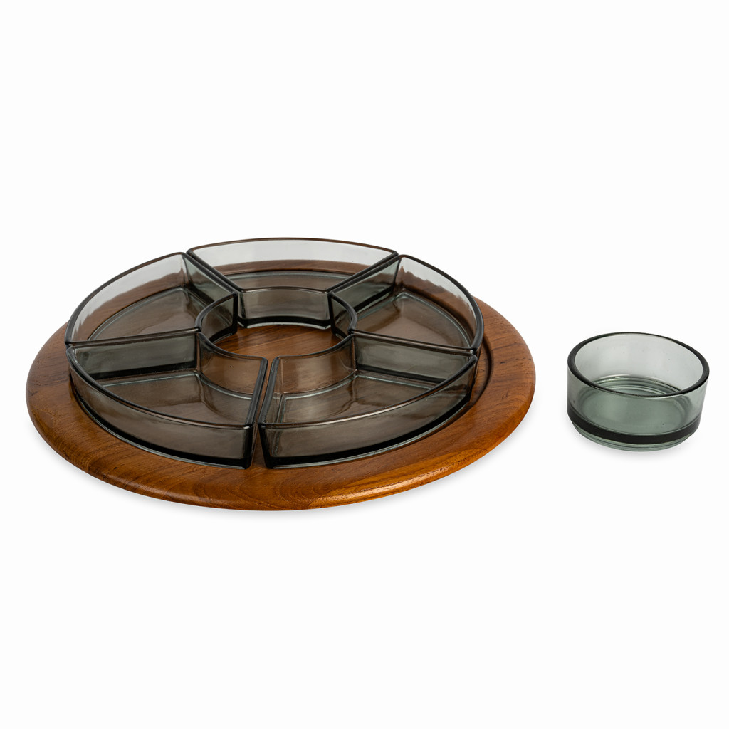 Servírovací misky vyrobené dánskou firmou Digsmed v šedesátých letech. Skleněné misky jsou zasazeny do teakového podnosu, kterým lze otáčet. Celý set je v perfektním stavu. Dřevo bylo vyčištěno a natřeno přírodním olejem na dřevo.