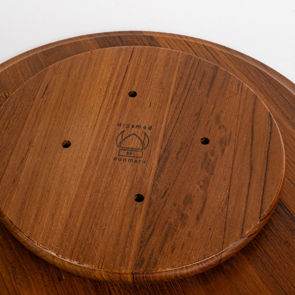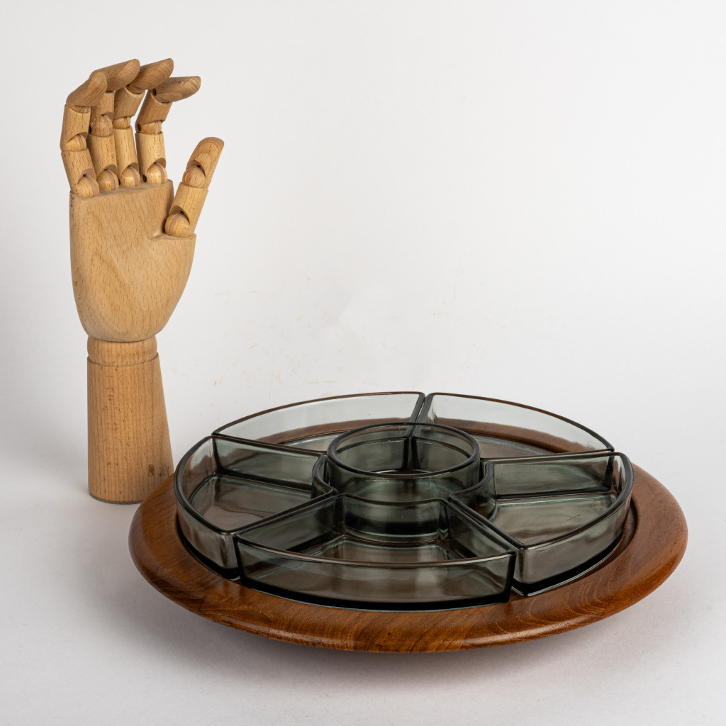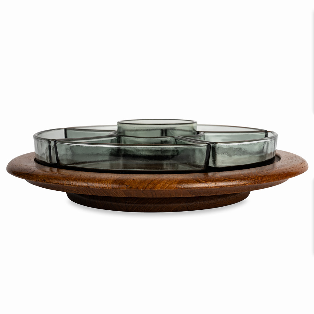 Servírovací misky vyrobené dánskou firmou Digsmed v šedesátých letech. Skleněné misky jsou zasazeny do teakového podnosu, kterým lze otáčet. Celý set je v perfektním stavu. Dřevo bylo vyčištěno a natřeno přírodním olejem na dřevo.