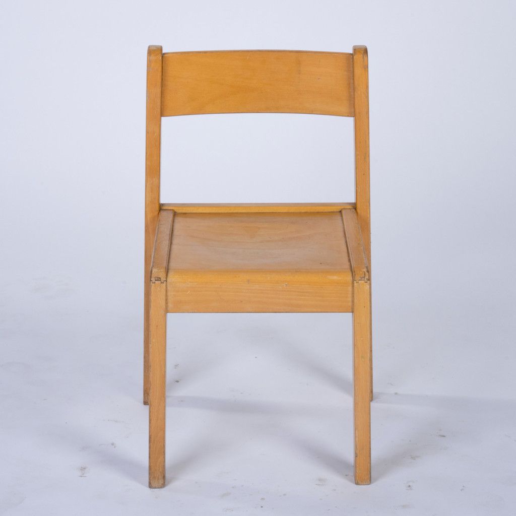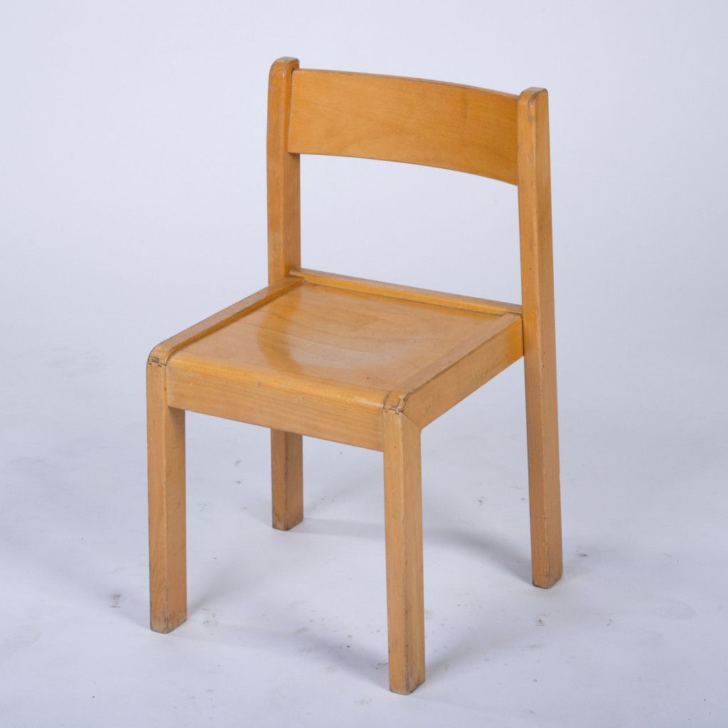 Dětská židlička z lakovaného bukového dřeva s jemně zaoblenými rohy. Povrch je v původním stavu s viditelnými stopami běžného používání.