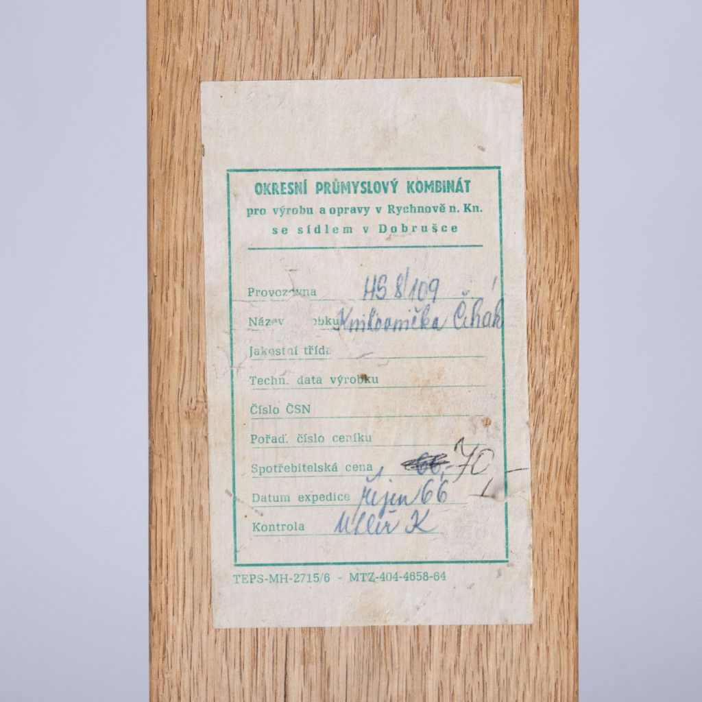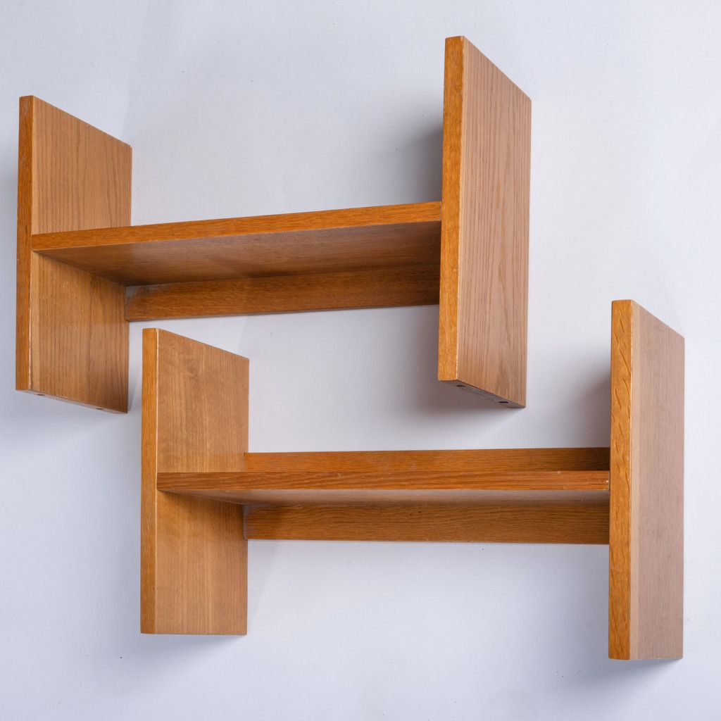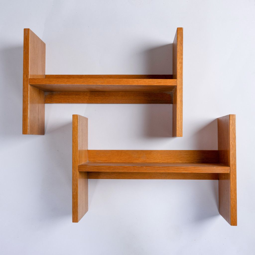 Dřevěná dubová polička či knihovnička ve tvaru širokého písmene H. Jednoduchá konstrukce s výraznou kresbou dubového dřeva a čistým geometrickým řešením. Na zadní straně má umístěny úchyty pro pověšení na zeď. Poličku lze využít na knihy, nebo květiny. Poličky je možné poskládat na sebe. Polička je v původním stavu. Na povrchu je mírná patina, konstrukce je pevná.