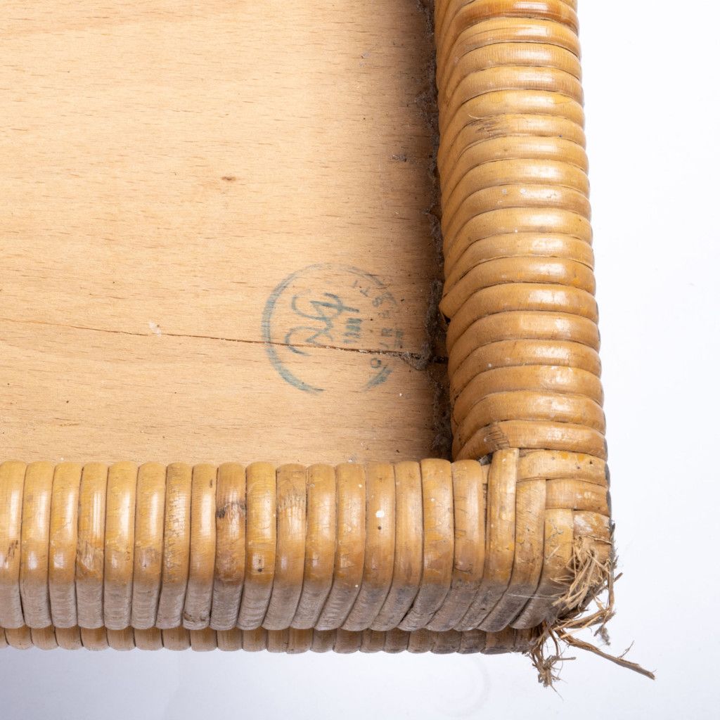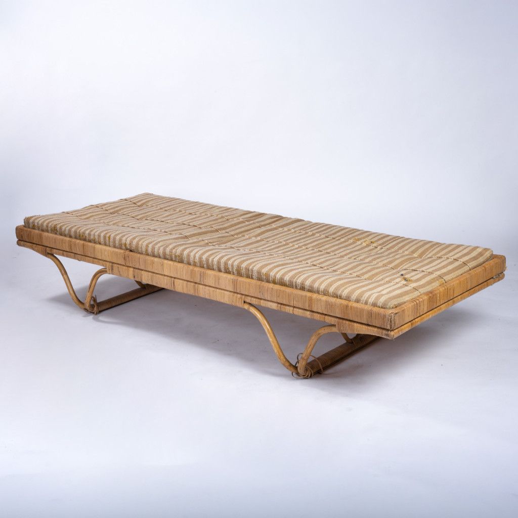 Dřevěné lehátko s konstrukcí z bambusu, ratanu a překližky. Kombinace materiálů vytváří lehký, přírodní vzhled. U jedné nohy je částečně rozpletené ratanové omotání, povrch nese známky opotřebení v podobě popraskaného a místy odlupujícího se laku. Součástí je velký polštář určený k sezení.