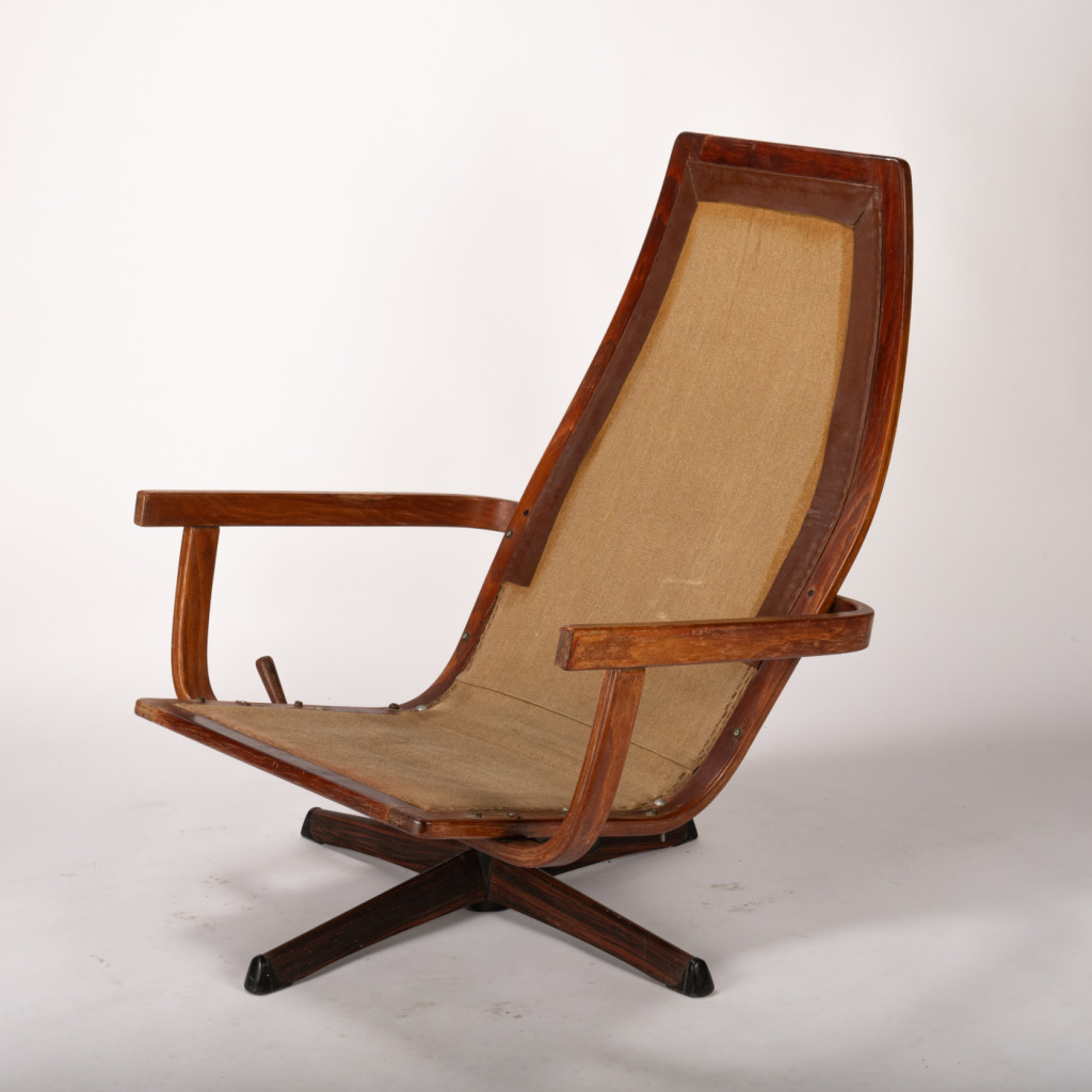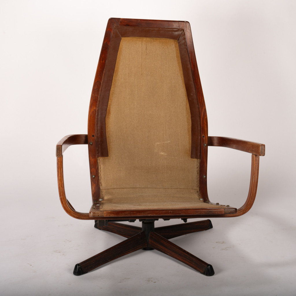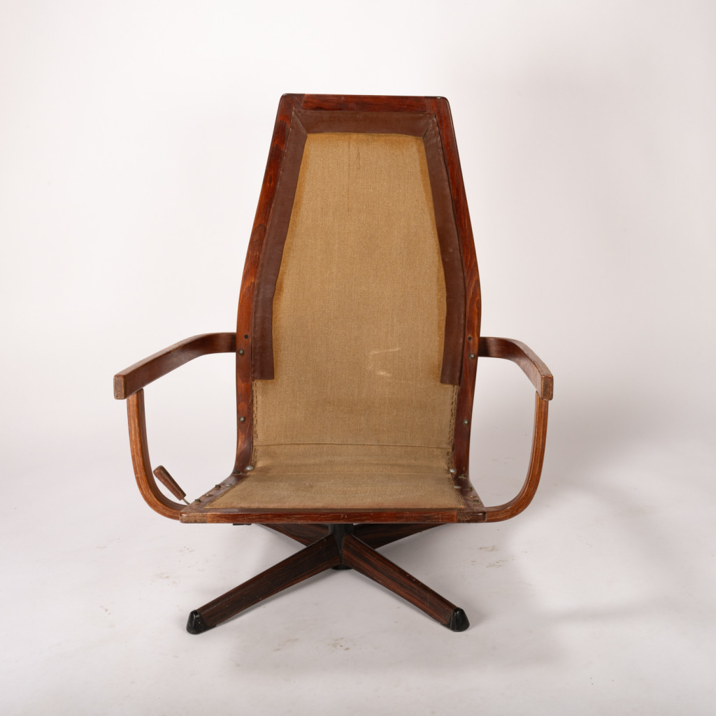 Dřevěné otočné křeslo vyrobené v 70. letech švédskou firmou Göte Möbler, Nässjö. Křeslo tvoří ocelová podnož a tělo z lepených teakových lamel v sytě hnědé barvě. Otáčení křesla je možné regulovat páčkou vespod křesla. Původně bylo součástí také čalounění.
