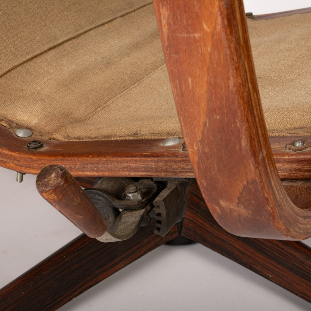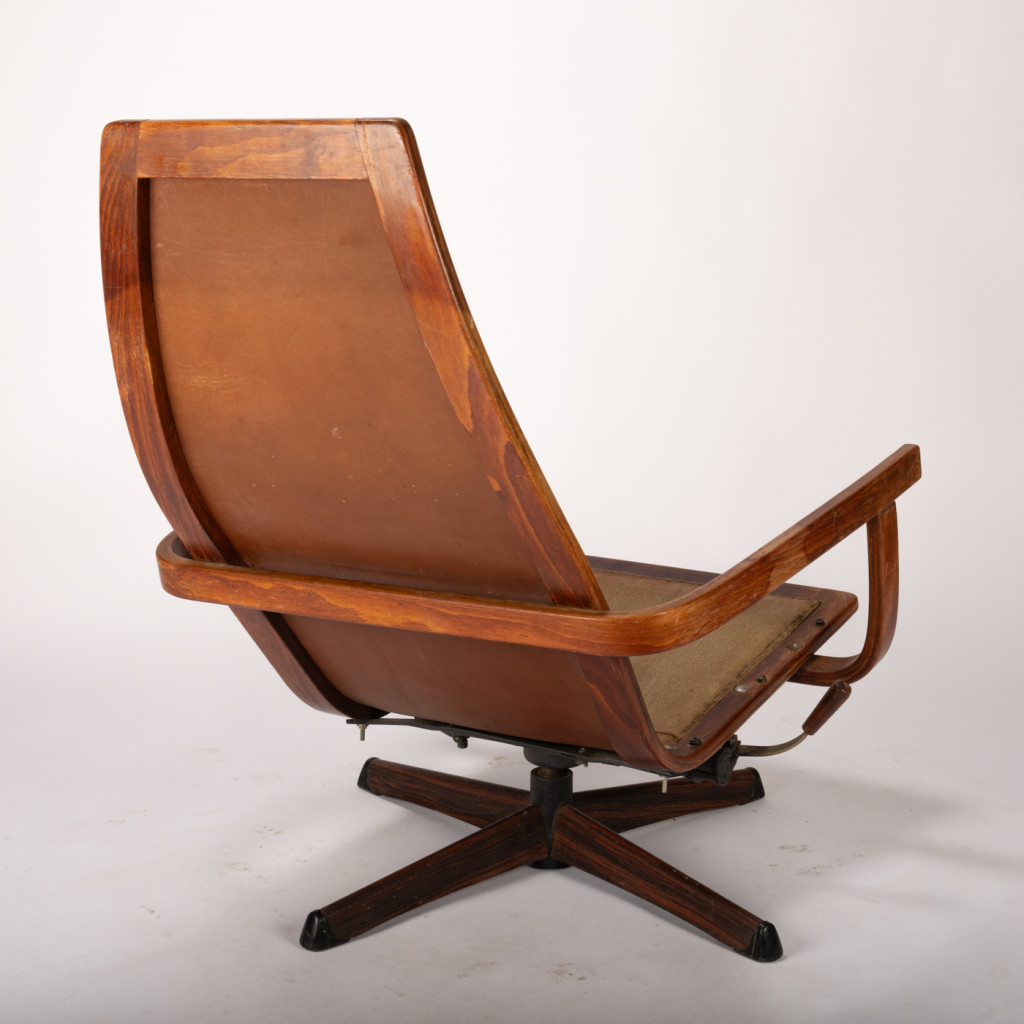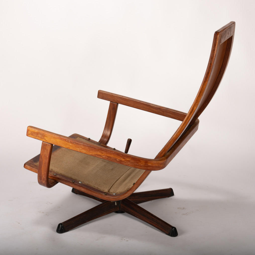 Dřevěné otočné křeslo vyrobené v 70. letech švédskou firmou Göte Möbler, Nässjö. Křeslo tvoří ocelová podnož a tělo z lepených teakových lamel v sytě hnědé barvě. Otáčení křesla je možné regulovat páčkou vespod křesla. Původně bylo součástí také čalounění.