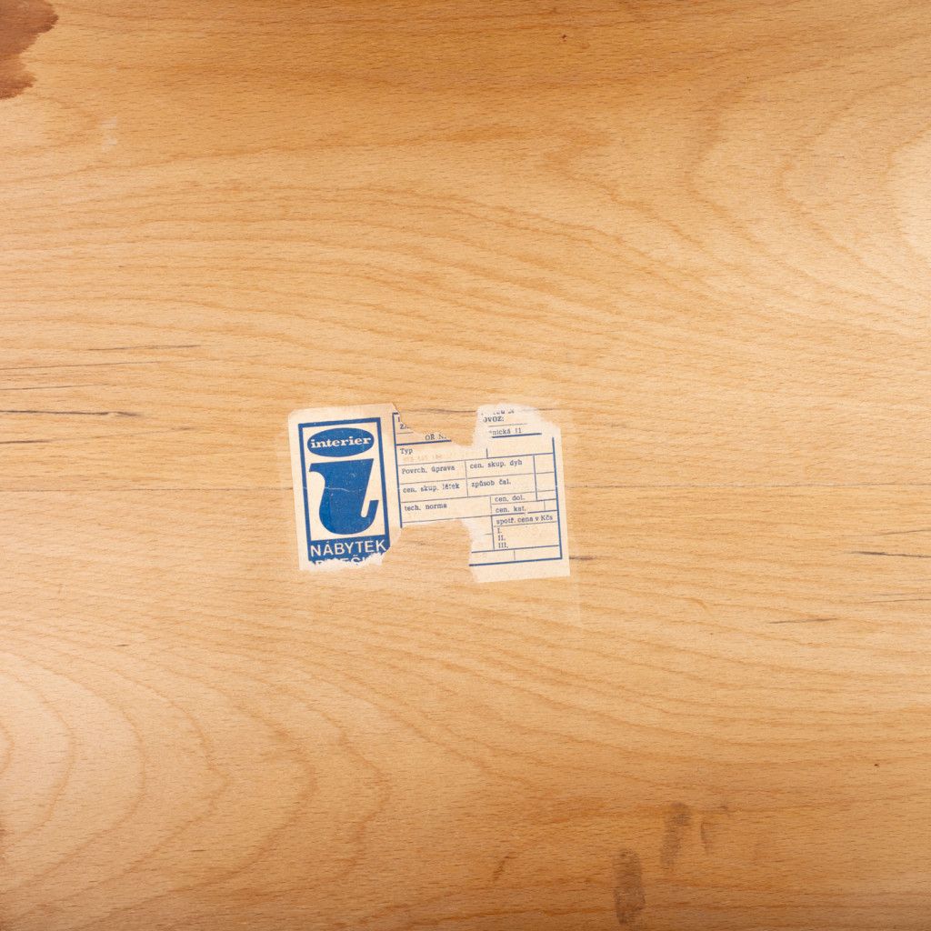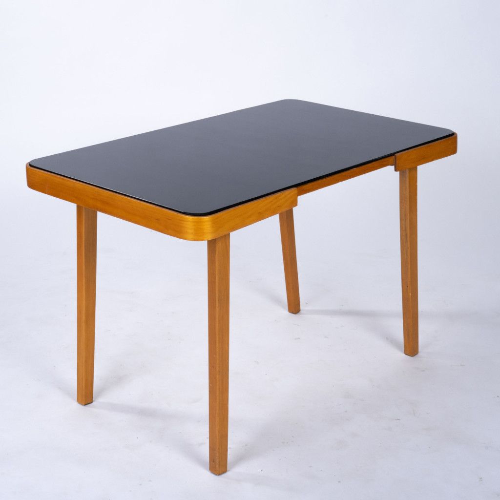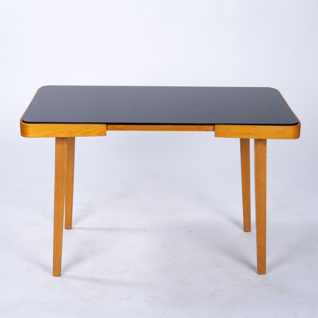 Konferenční stolek z masivního buku s černou opaxitovou deskou. Povrch opaxitové desky je místy poškrábaný vlivem běžného používání. Konstrukce z bukového dřeva je pevná. Stolek je plně funkční a zachovalý.