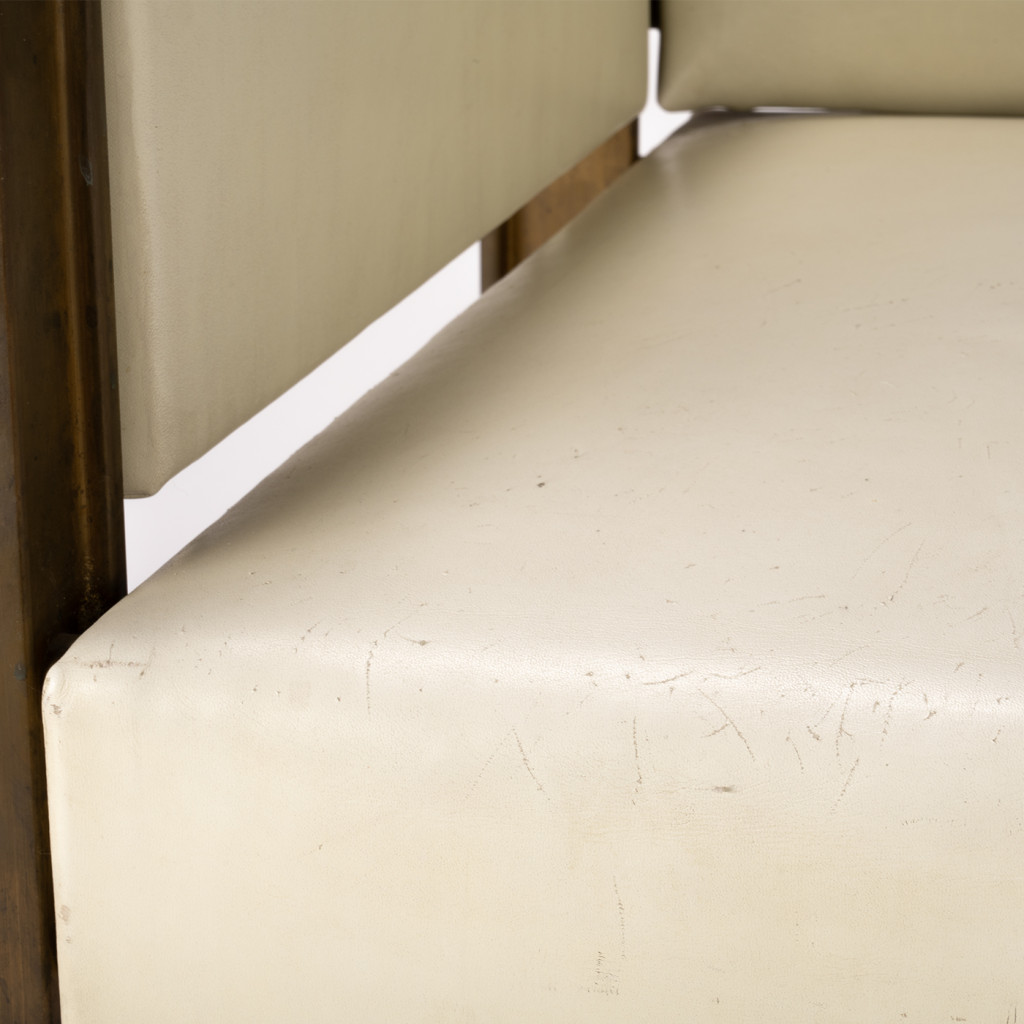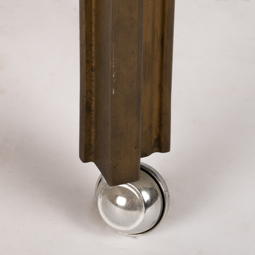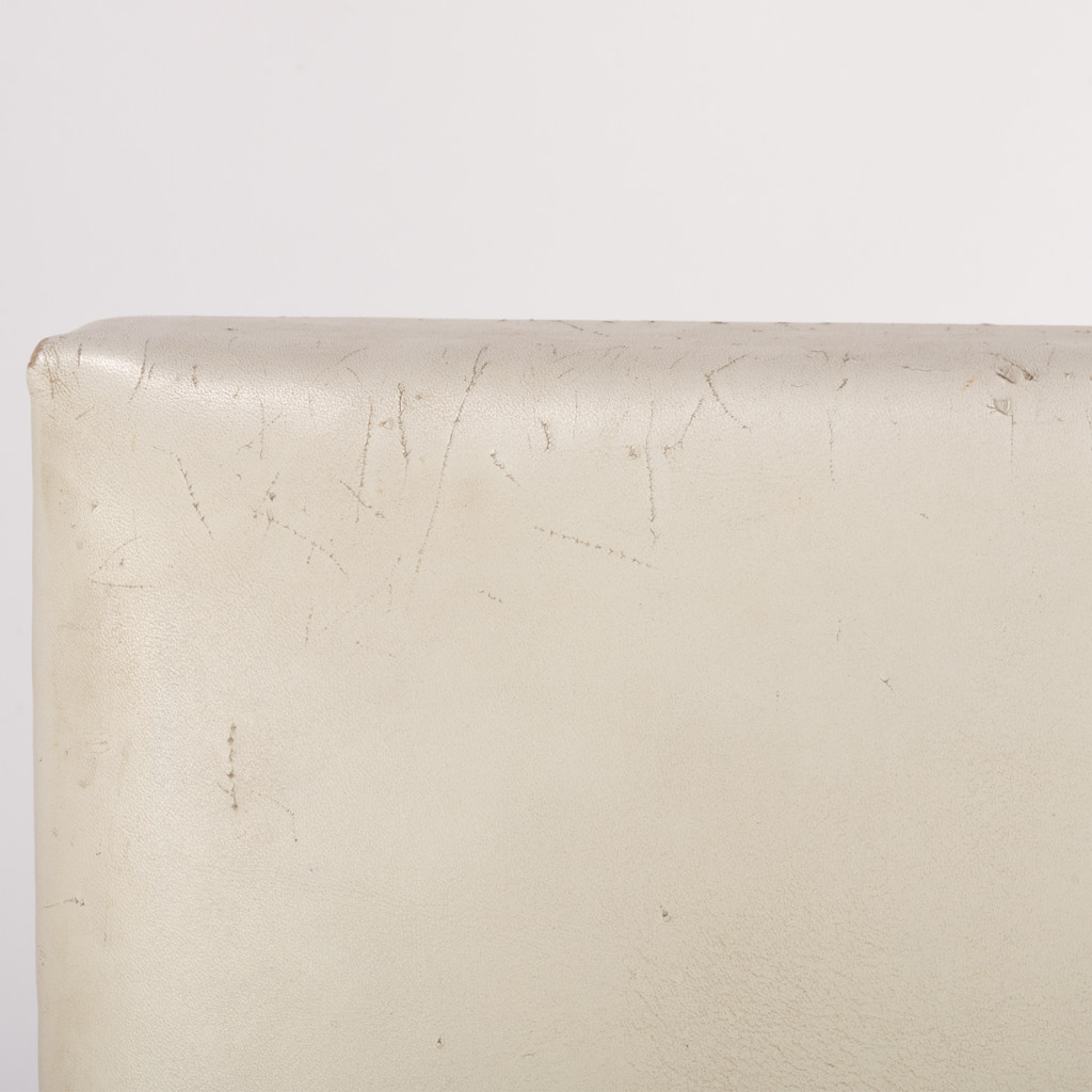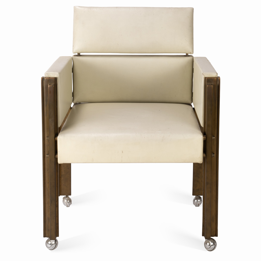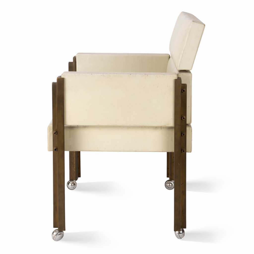 The structure of the chair is made of brass, the upholstery is made of white imitation leather and the legs are finished with castors. The chair is in its original condition with signs of use and age. The imitation leather is damaged in places.