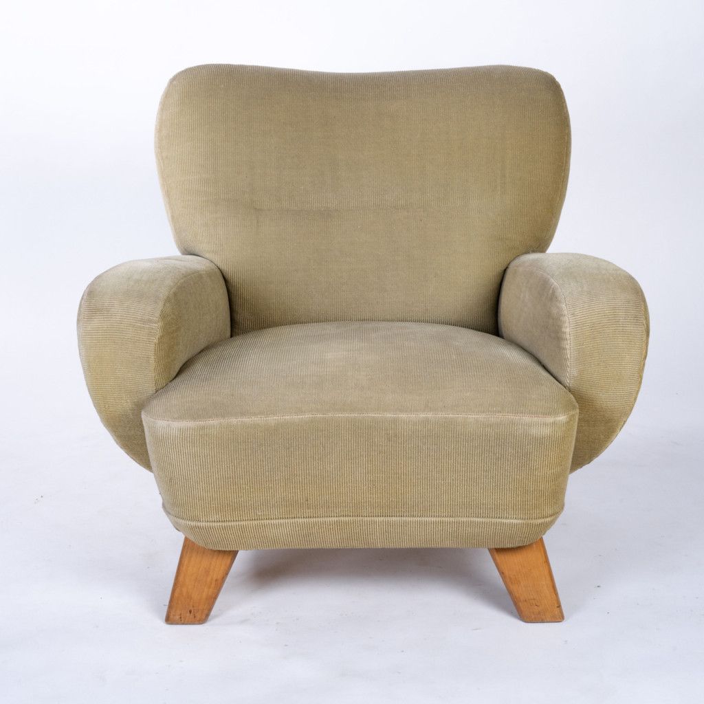 Very comfortable upholstered armchair with a springed seating and a high-quality solid oak frame. The armchair was reportedly custom-made along with other furniture as a wedding gift from architect Karel Caivas for his daughter or son (exact details are unknown).