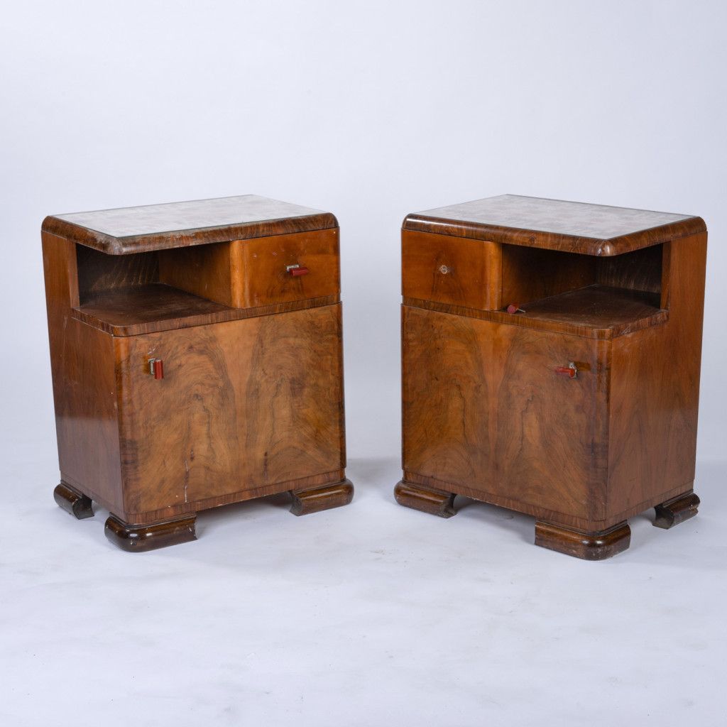 A wooden bedside table with a glass top, with a woven fabric beneath. The exterior is finished with walnut veneer, while the interior is made of a combination of beech and mahogany. The drawer features metal and plastic handles. There are visible scratches in the wood on the exterior surface; otherwise, the bedside table is in good and fully functional condition.
