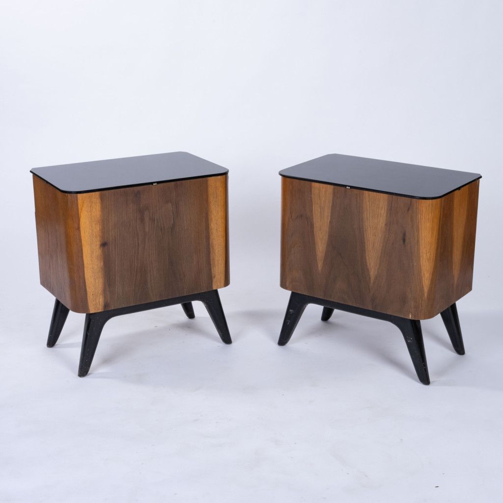 Bedside table with a black Opaxite top, a drawer, and a lower cabinet that opens. The body is covered with oak veneer with a natural grain; there are minor chips in places and slight signs of wear on the surface. In terms of structure the table is fully functional and well-preserved.