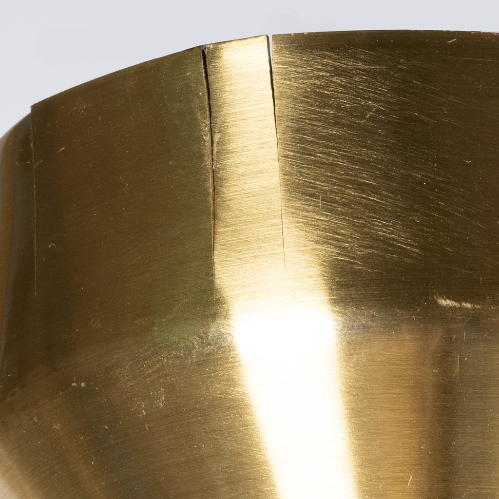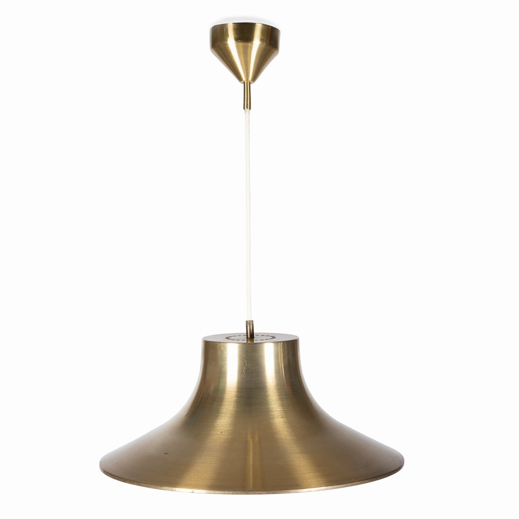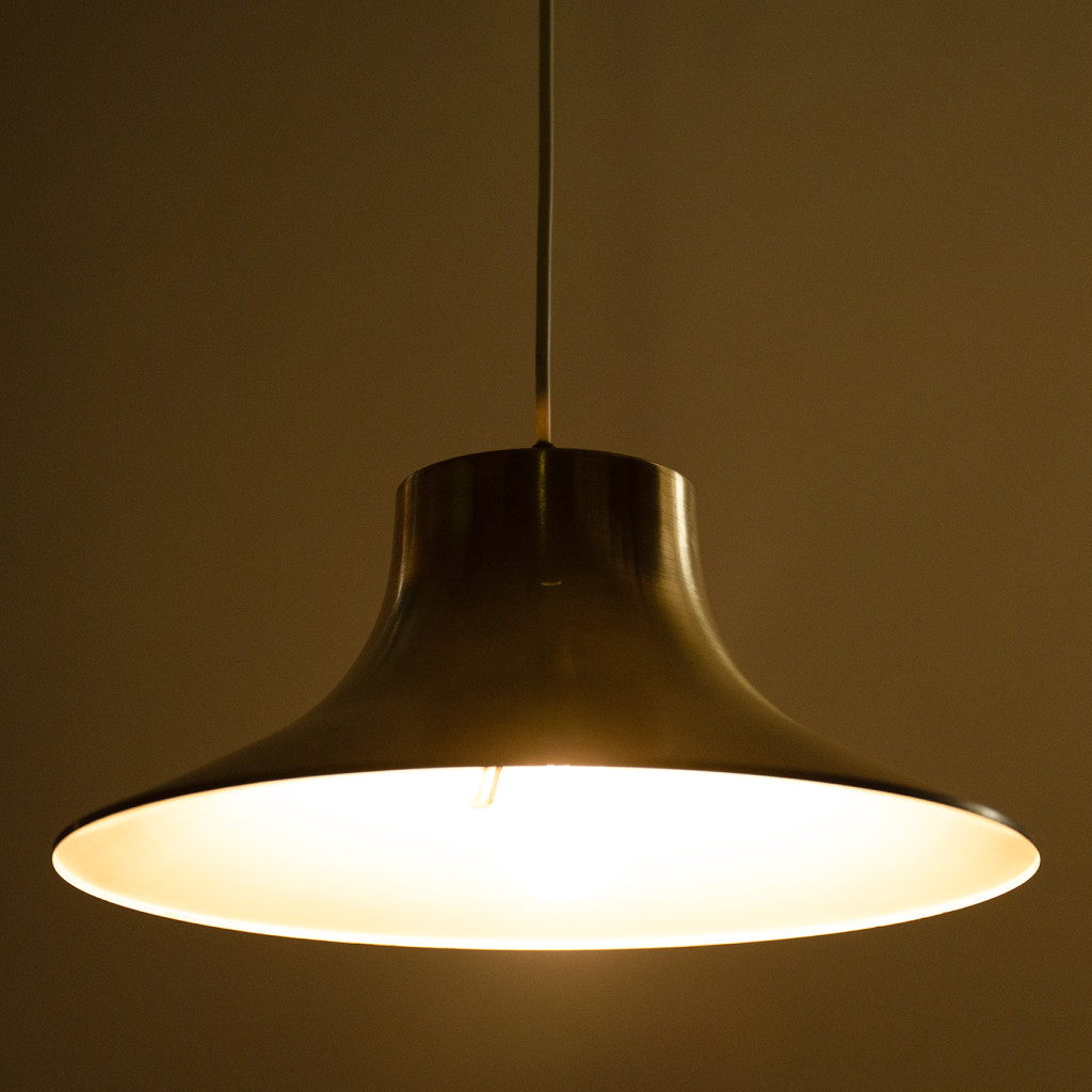 This light fixture has a brass body with decorative perforations at the top. The inside of the lampshade is painted matte white. It hangs from a white rubber cable with a brass end.