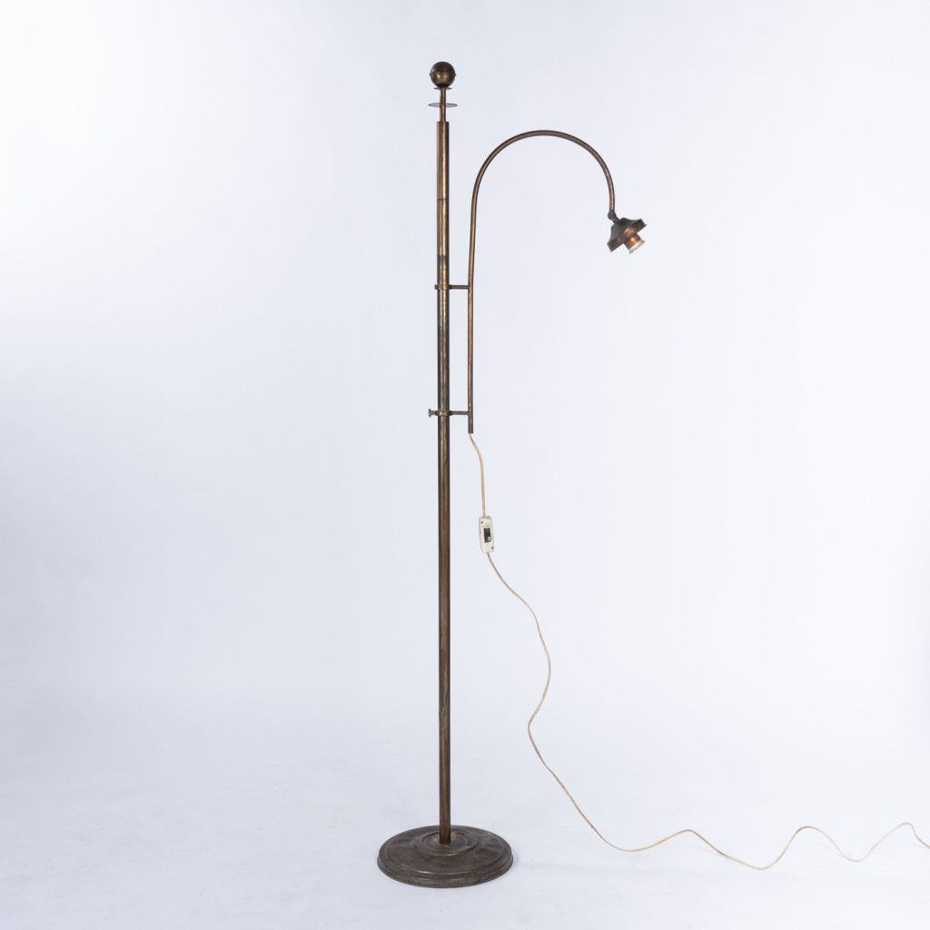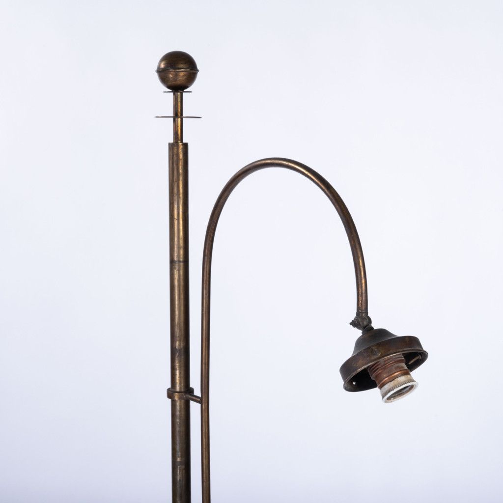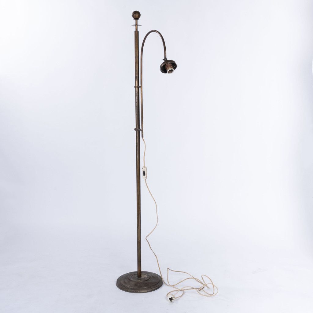 Brass floor lamp with a metal frame in its original condition. The surface shows signs of wear, including a scuffed base, scratches, and visible corrosion in places. Overall, a well-preserved piece with an authentic patina.