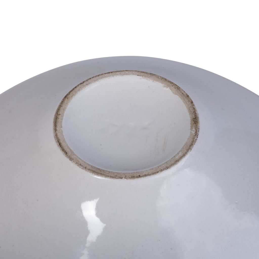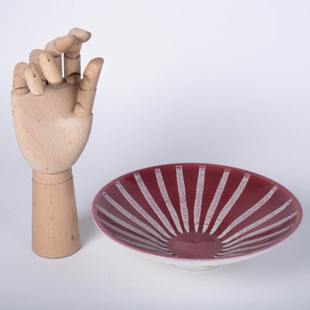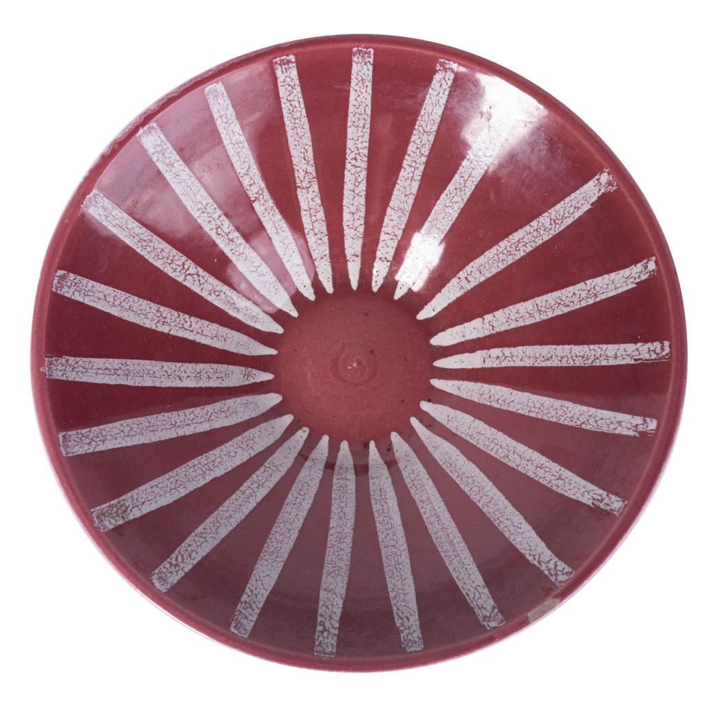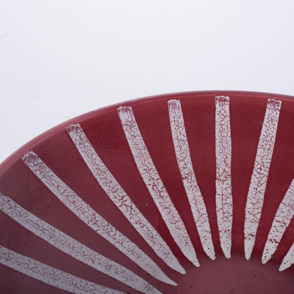 Round ceramic bowl in the Brussels style with a dark pink glaze and a hand-painted motif of white rays, likely from the 1960s. The ray-like decoration converging toward a loose central circle is typical of this period. The motif appeared on everything from wall clocks to mirrors to tableware. The bowl is in very good original condition, with a chip in one spot on the rim.