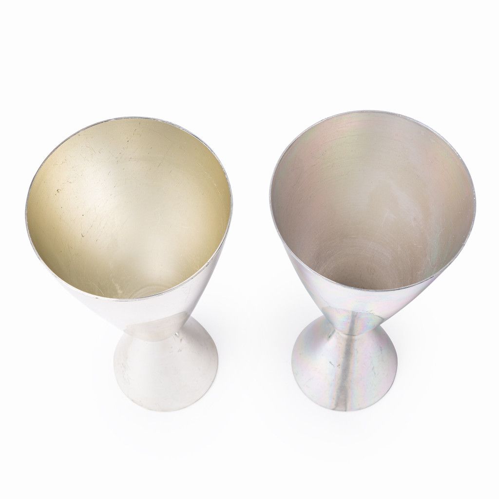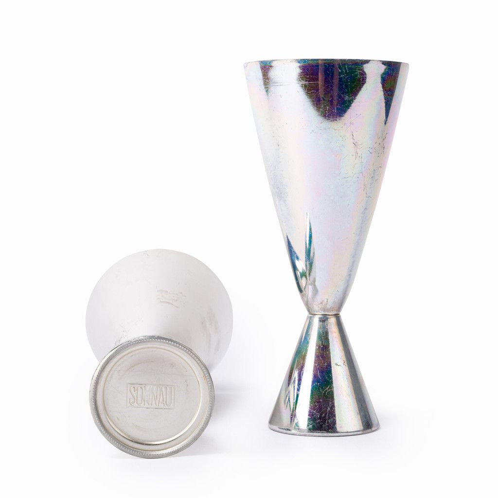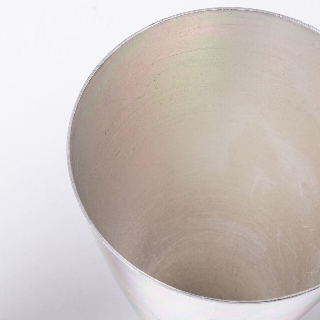 Set of six champagne cups made by the German producer Sonnau based in the city of Chemnitz in Saxony. The cups are made of polished aluminum, they were produced in several colour variants and sold together in sets. The bottom part of the cups is filled with small metal balls, giving them a stable center of gravity. There is an embossed company brand on the underside of two of them. The cups are in good original condition; they are scratched in places and have a patina.