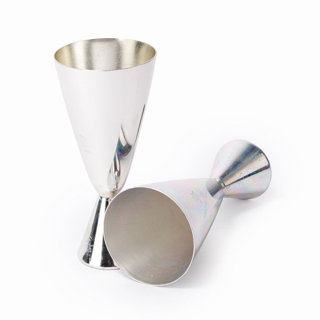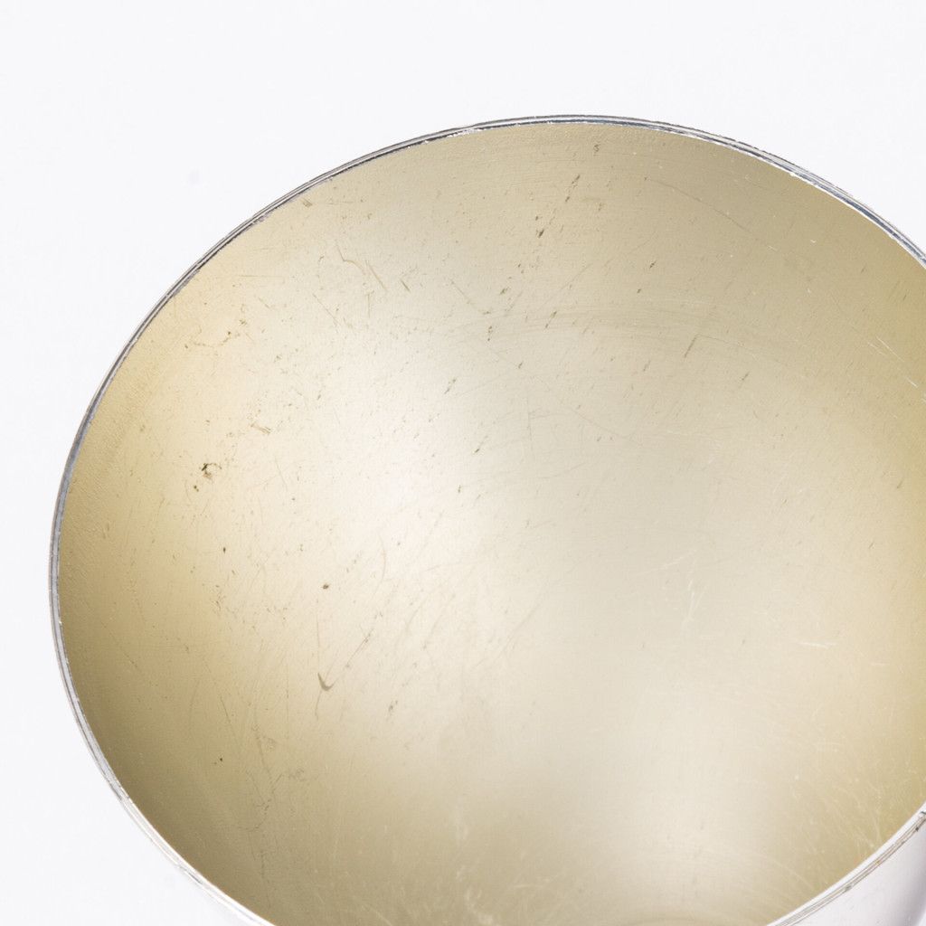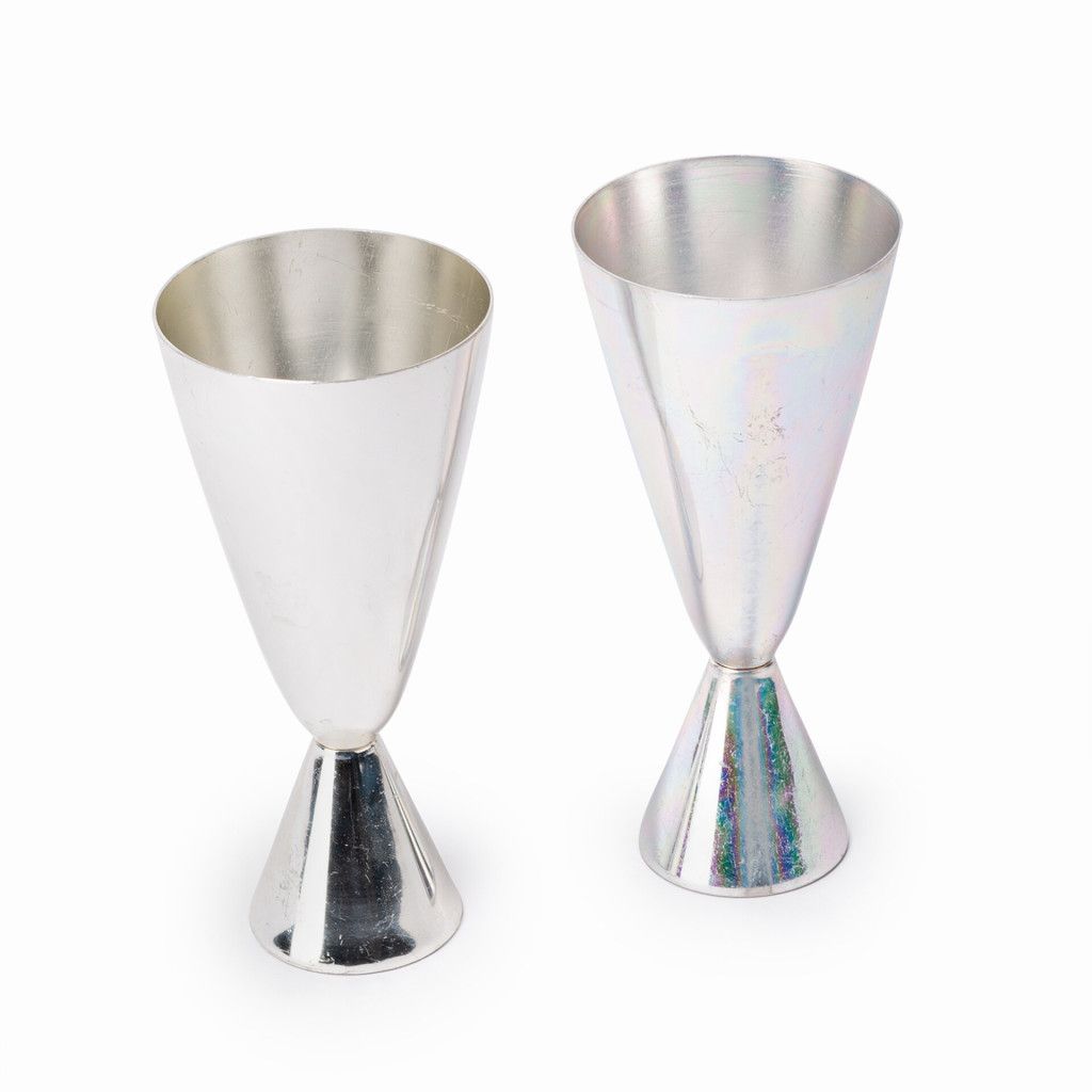 Set of six champagne cups made by the German producer Sonnau based in the city of Chemnitz in Saxony. The cups are made of polished aluminum, they were produced in several colour variants and sold together in sets. The bottom part of the cups is filled with small metal balls, giving them a stable center of gravity. There is an embossed company brand on the underside of two of them. The cups are in good original condition; they are scratched in places and have a patina.