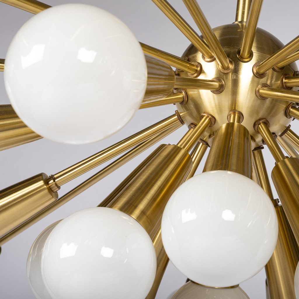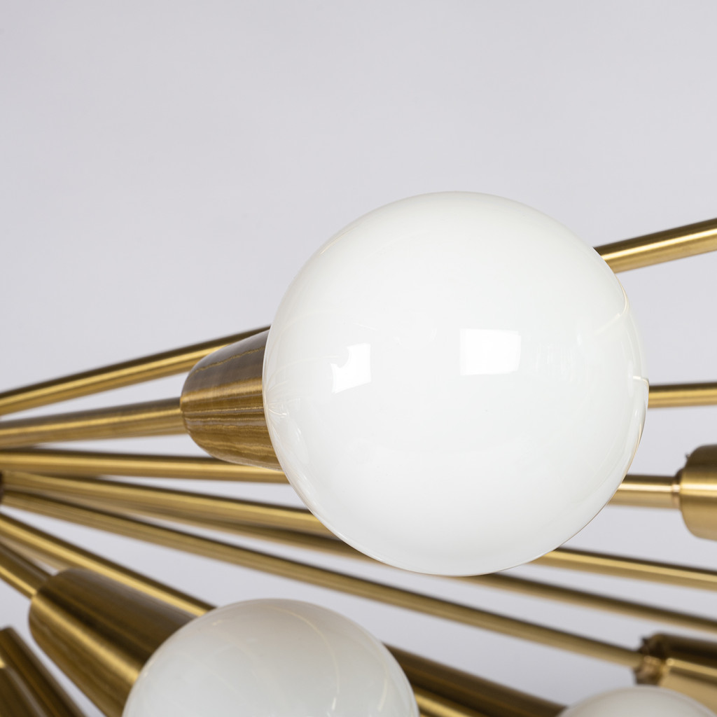 The chandelier consists of a robust golden brass framework. From its spherical base grow forty thin gold bars, each topped with a flared bulb socket.