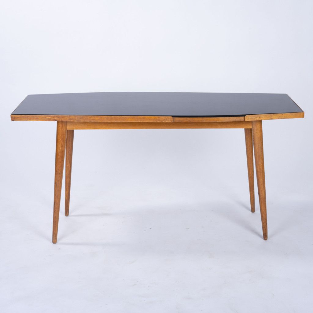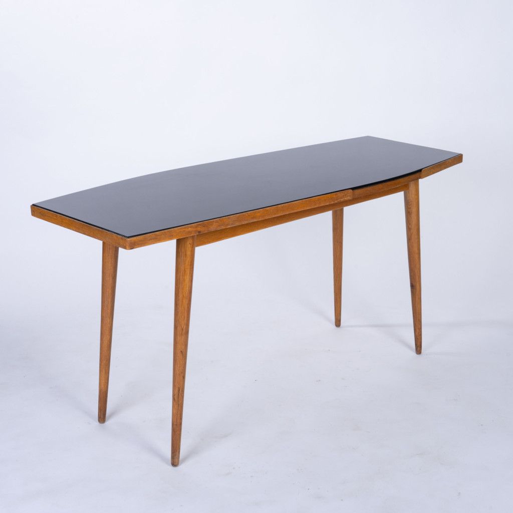A beech wood coffee table with a black Opaxite top. It has a rare, unique shape resembling a wave. The surface shows normal signs of wear, and the construction is sturdy.