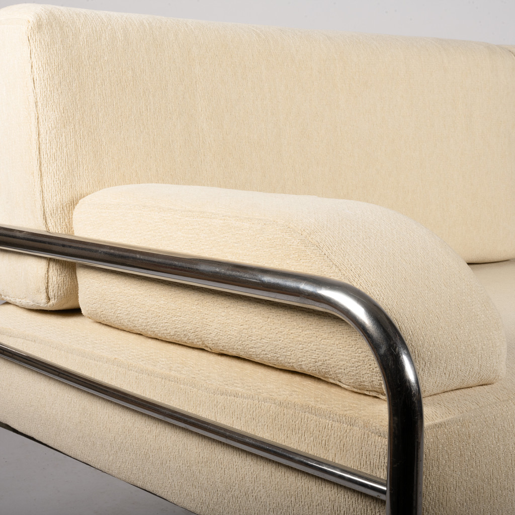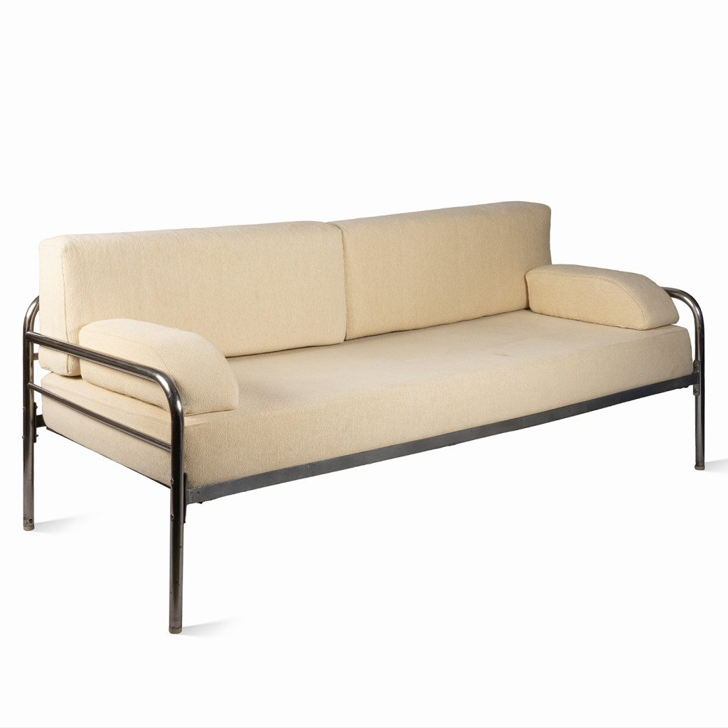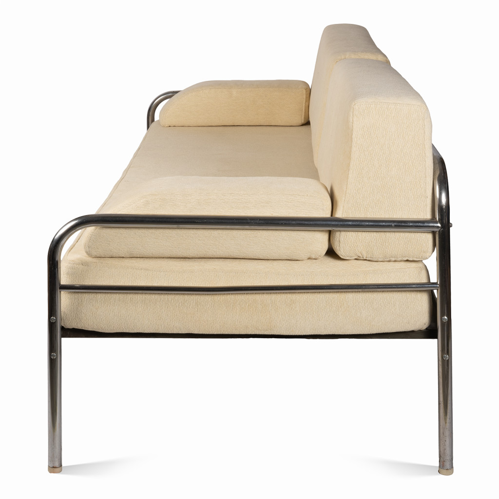 A functionalist sofa from the 1930s in the Bauhaus style, characterized by clean geometric lines, simplicity, and maximum functionality. The frame is made of chrome-plated tubular steel, and the upholstery consists of five separate cushions with cream-colored covers.