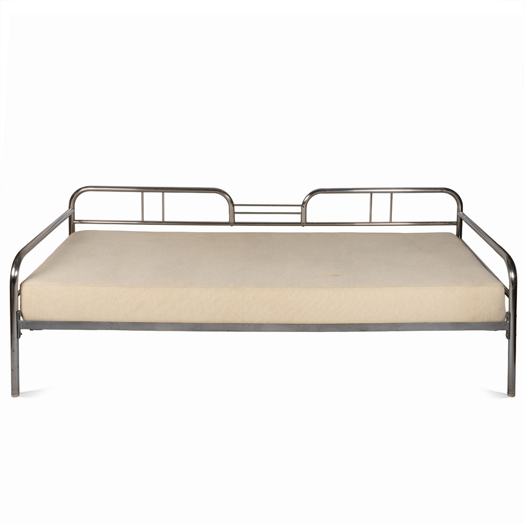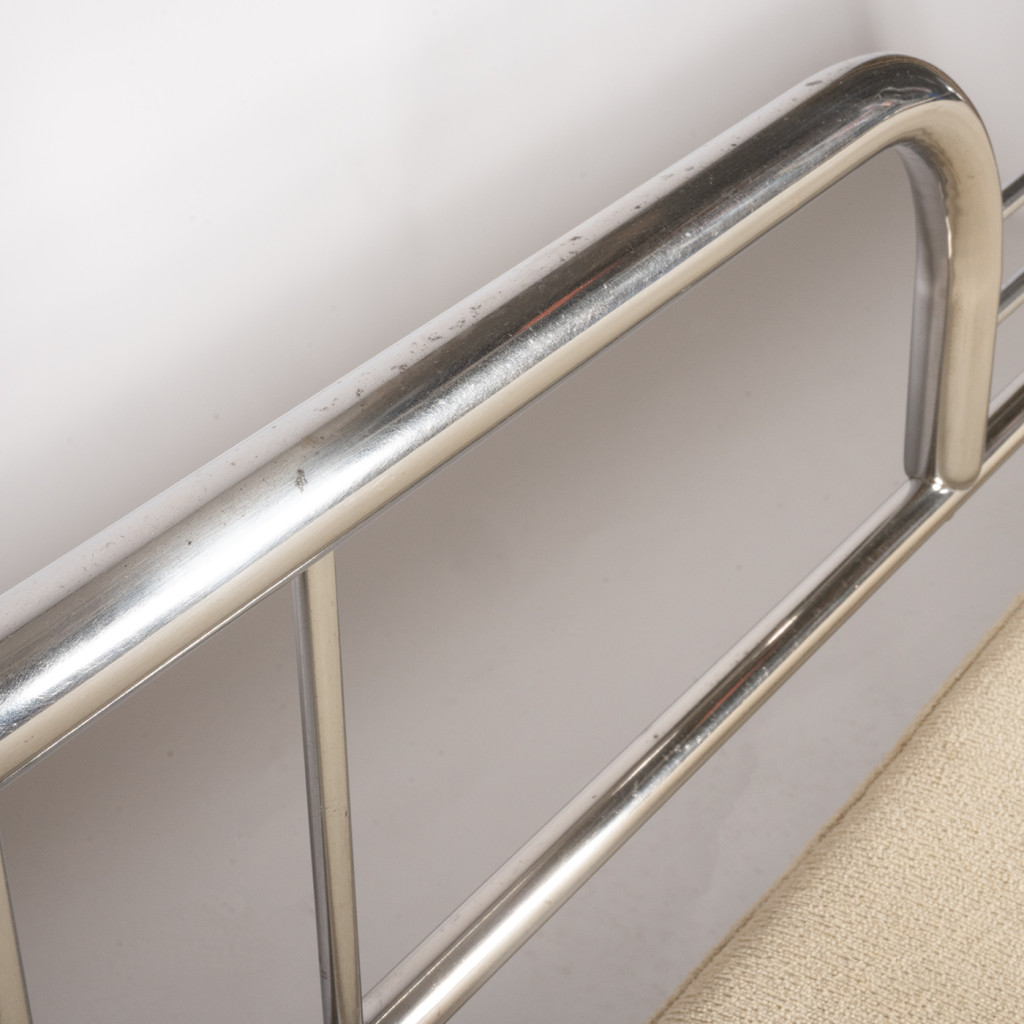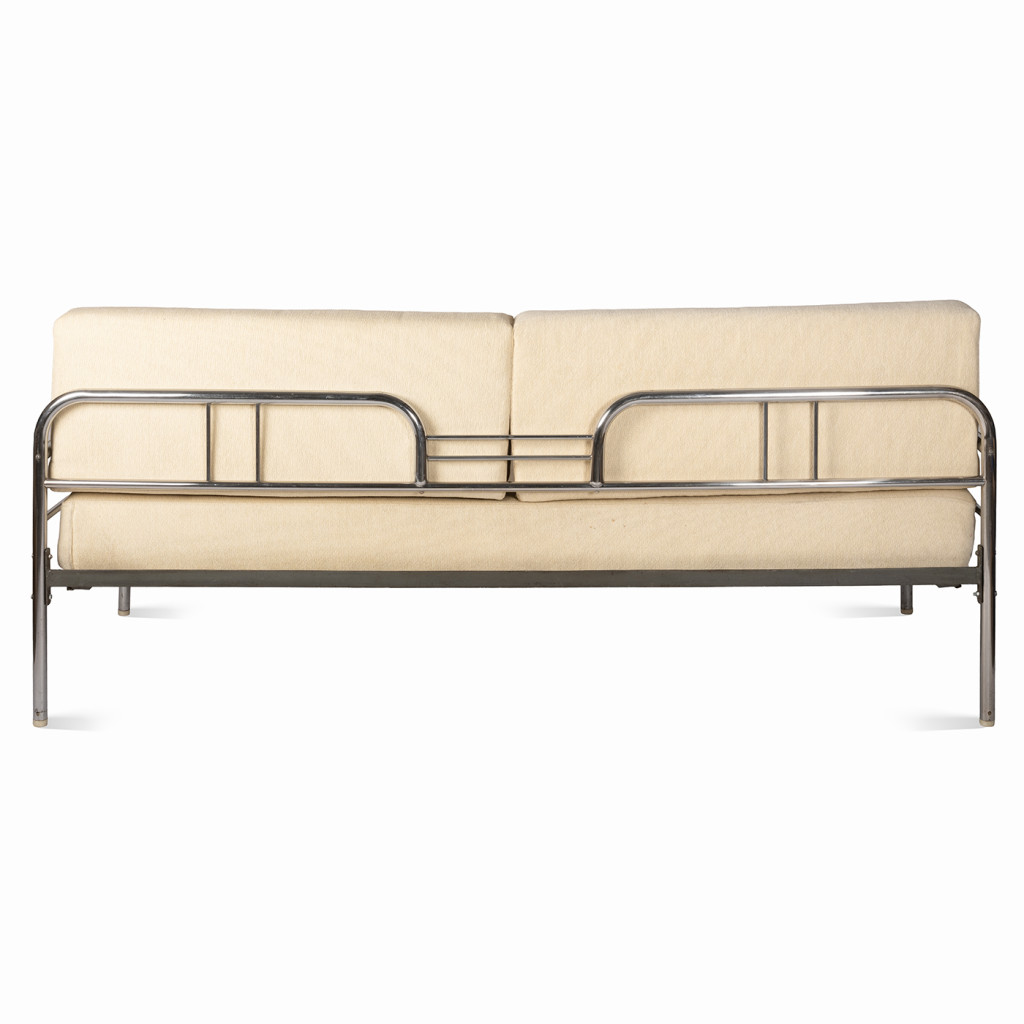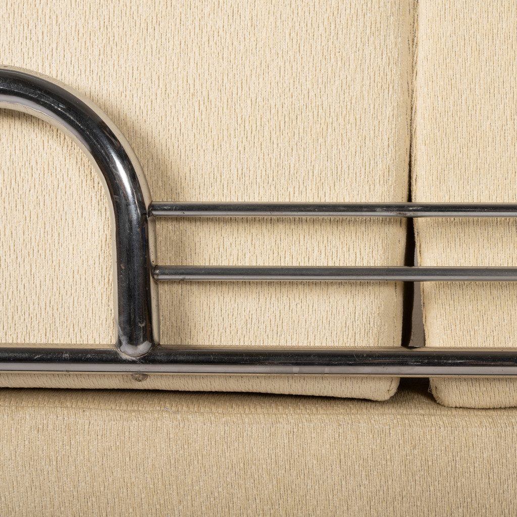 A functionalist sofa from the 1930s in the Bauhaus style, characterized by clean geometric lines, simplicity, and maximum functionality. The frame is made of chrome-plated tubular steel, and the upholstery consists of five separate cushions with cream-colored covers.