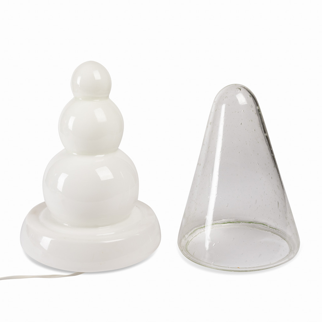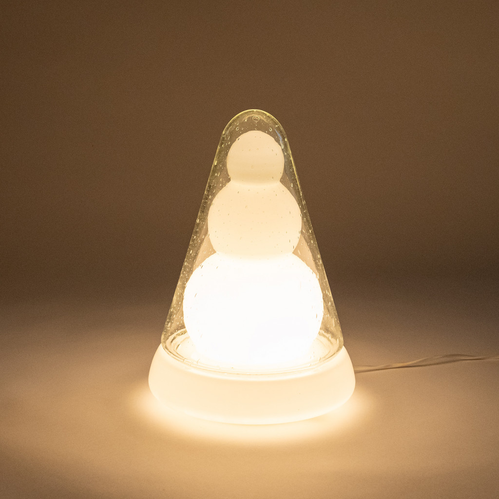 Atypical table lamp made of several layers of glass. The shaped inner part in frosted glass is covered by a rounded needle in clear glass with sealed bubbles. When lit, the frosted glass creates a pleasant diffused light, while the shape of the inner part stands out. The lamp is fully functional and has been left in its original condition.
