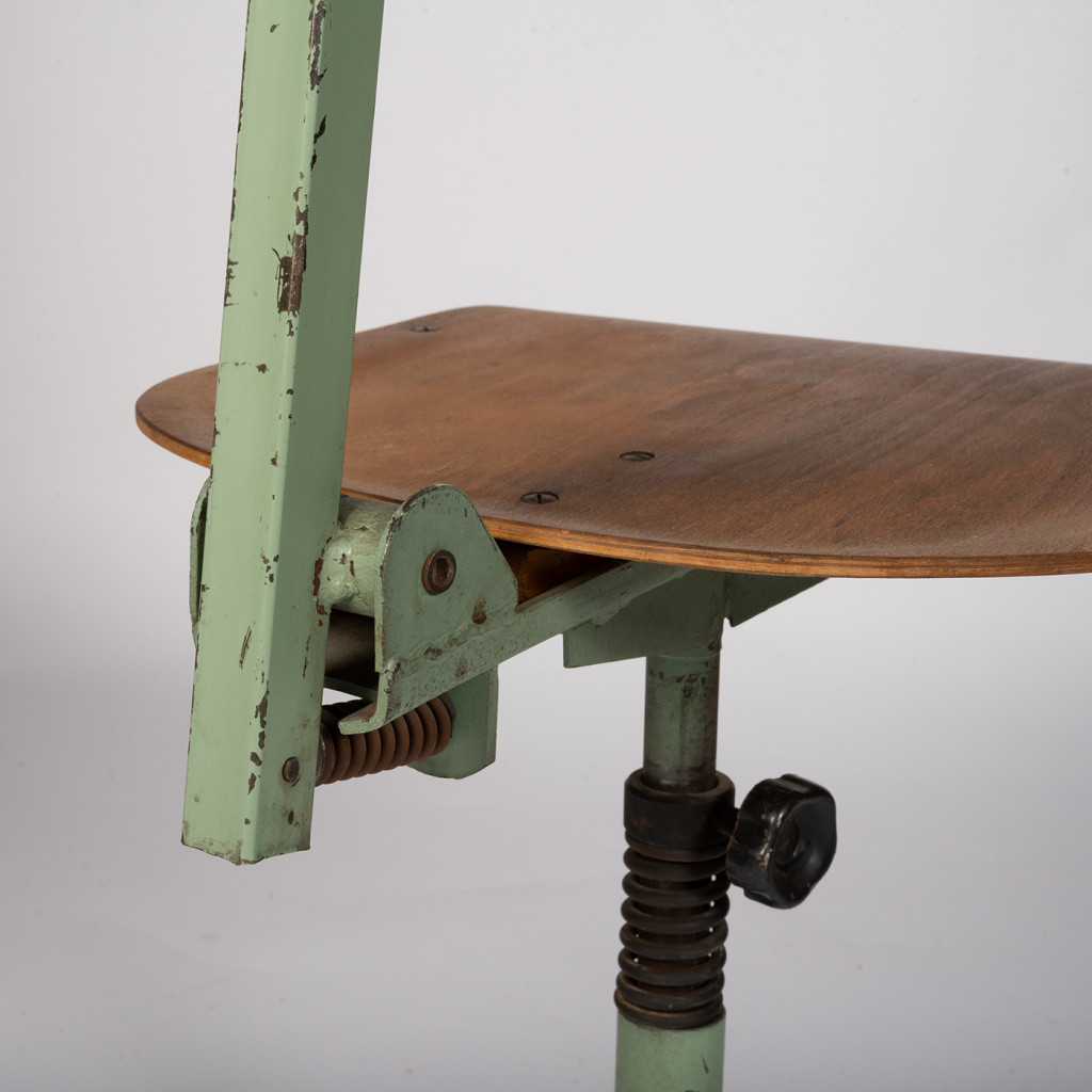The chair has a metal frame painted light green and a seat with a backrest made of beech wood stained in a light shade. Both can be adjusted. The chair has a similar shape to the iconic "Baťa chair" – the chair used by workers at the Baťa factory in Zlín.
