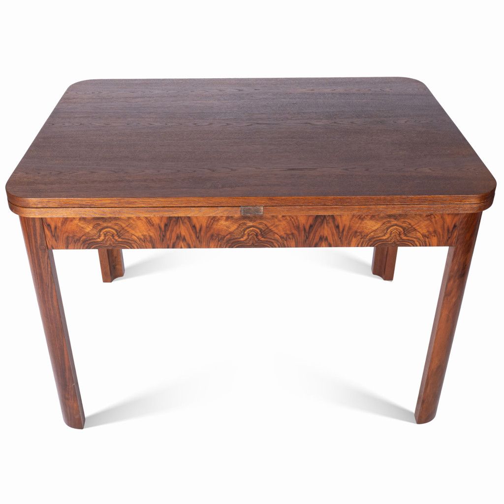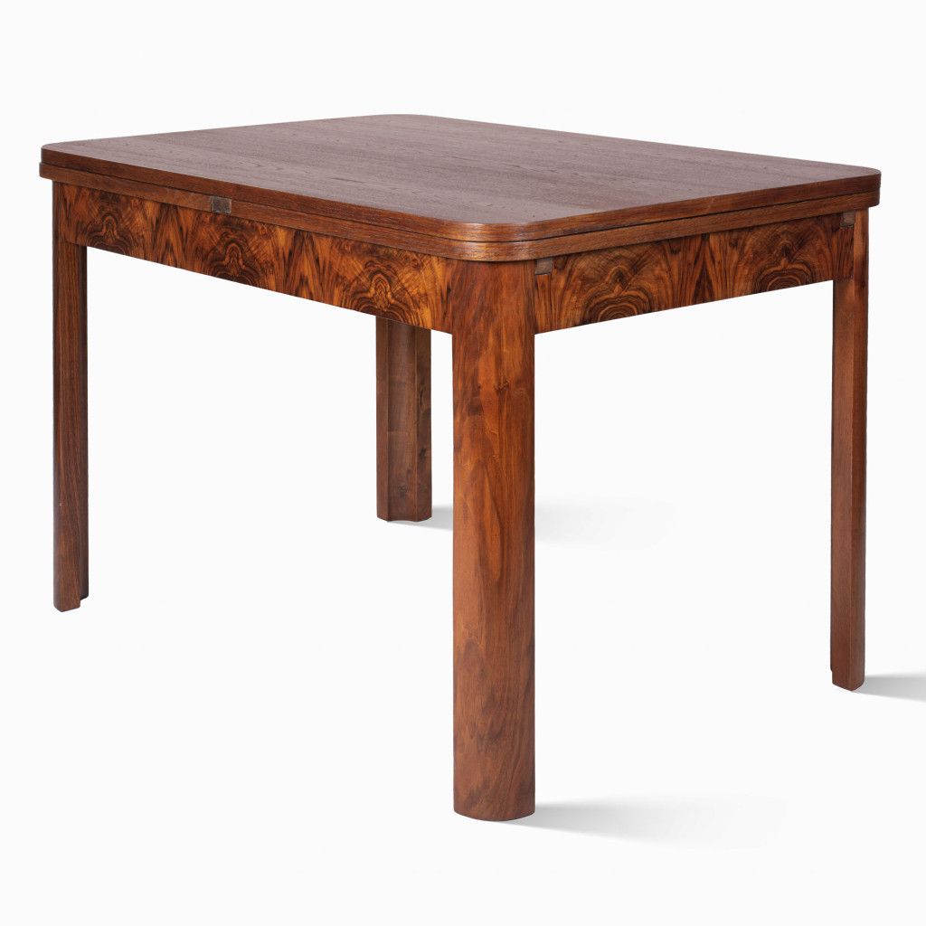 Folding dining table produced in the 1950s by UP závody based on a design by Jindřich Halabala. The table is made of solid walnut; the beech frame and oak center panel are covered with walnut veneer. The wood has a distinctive grain and is stained a rich brown colour. It is in great condition after a complete renovation in our workshop.