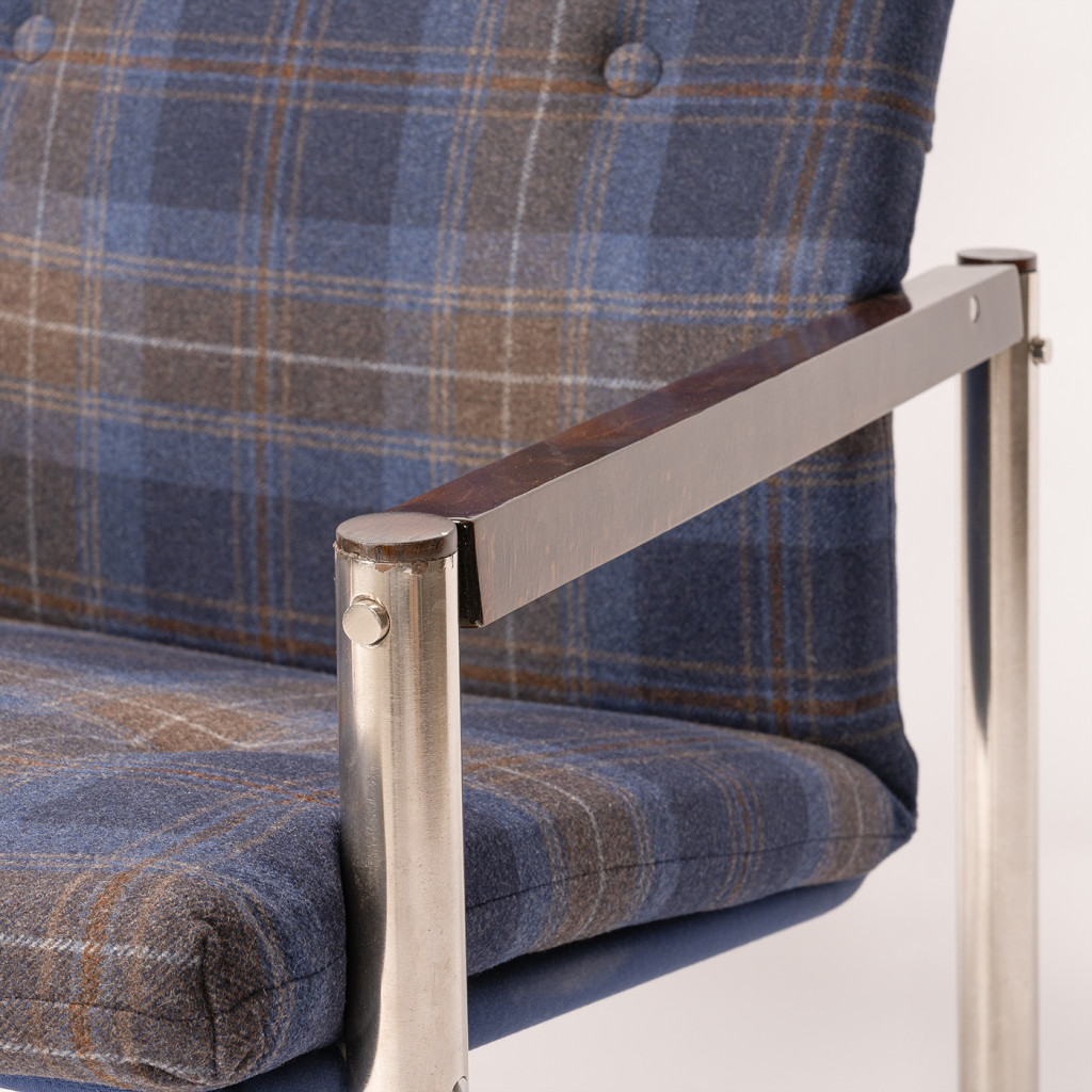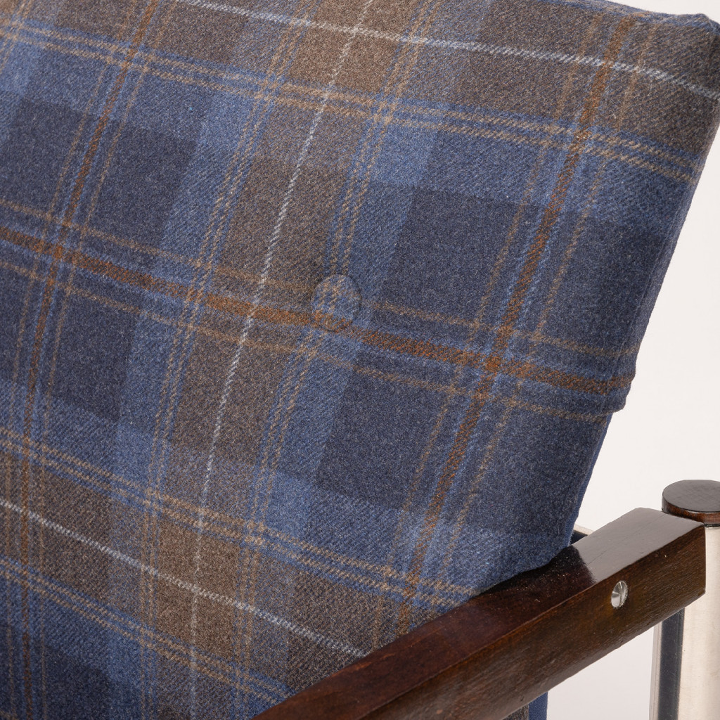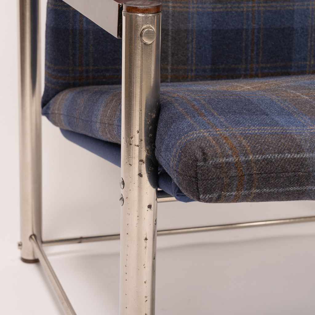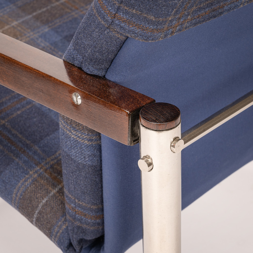 The chair was manufactured in 1978 in the District Enterprise for Local Development Sokolov, according to the design by Petr Švácha. The chair features a longitudinal shape design and four chrome-plated legs that provide a stable base. The structure is connected at the base by four more tubes. The wooden parts were renovated in the workshop, the chrome parts were carefully cleaned and the chair was reupholstered.