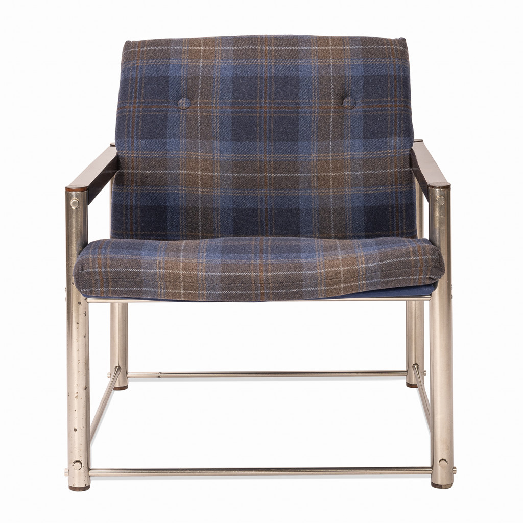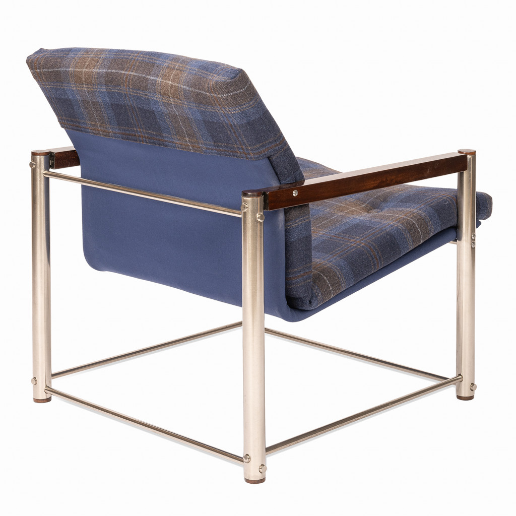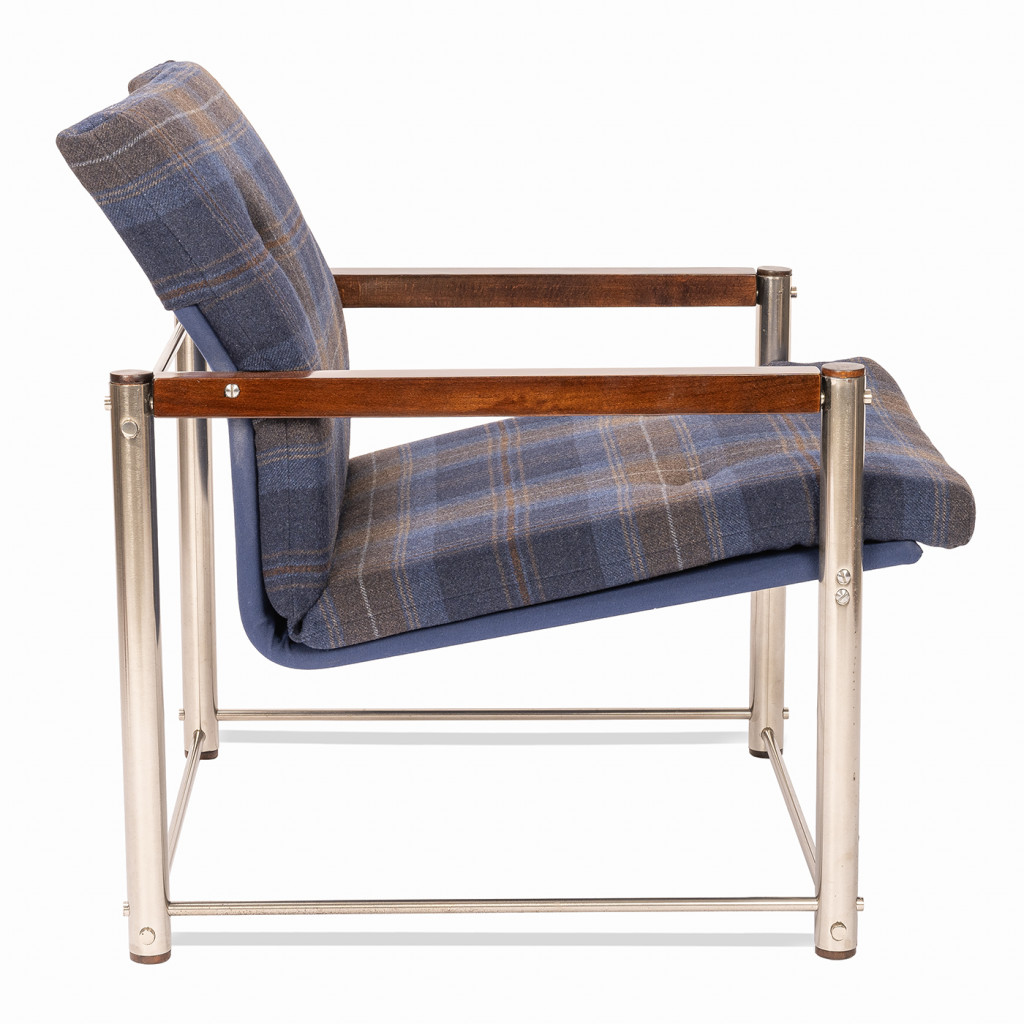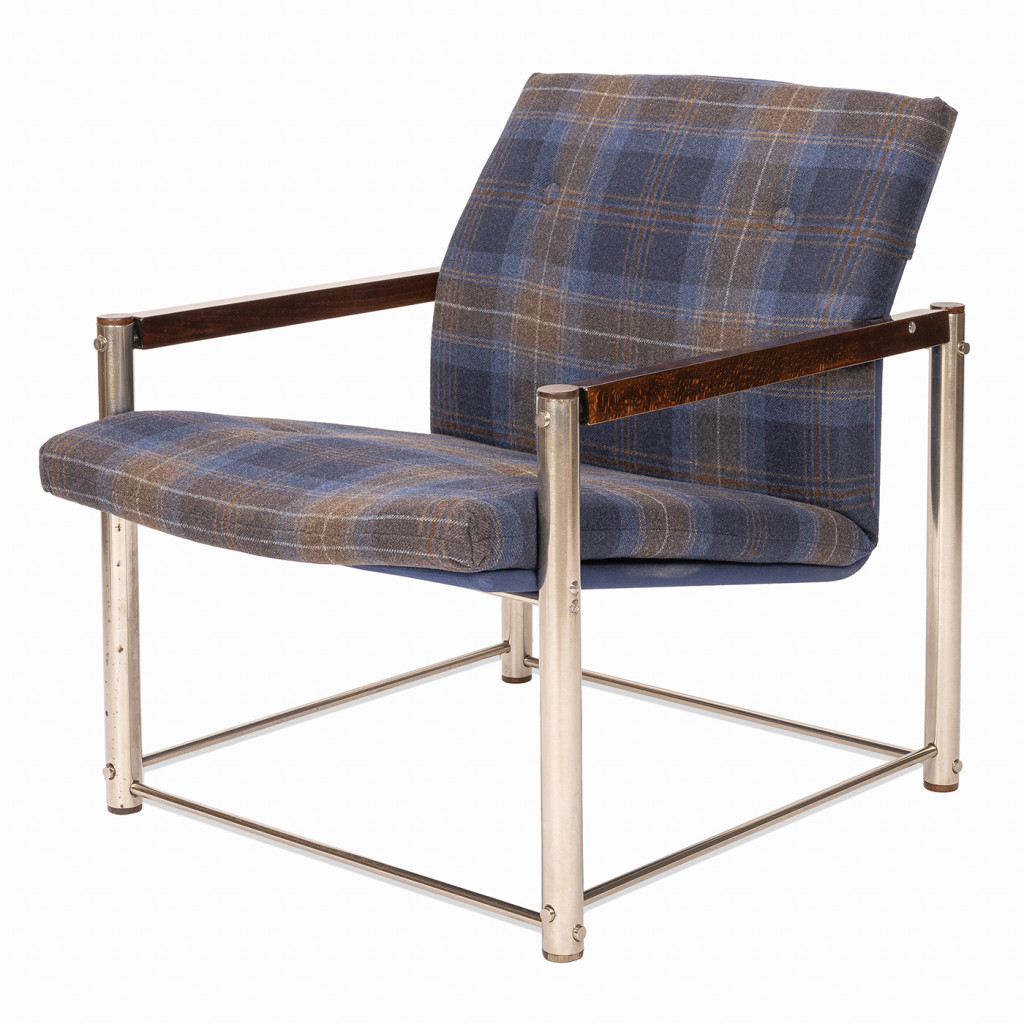 The chair was manufactured in 1978 in the District Enterprise for Local Development Sokolov, according to the design by Petr Švácha. The chair features a longitudinal shape design and four chrome-plated legs that provide a stable base. The structure is connected at the base by four more tubes. The wooden parts were renovated in the workshop, the chrome parts were carefully cleaned and the chair was reupholstered.