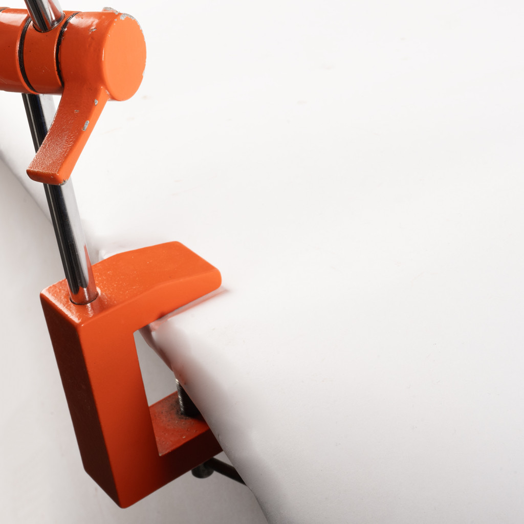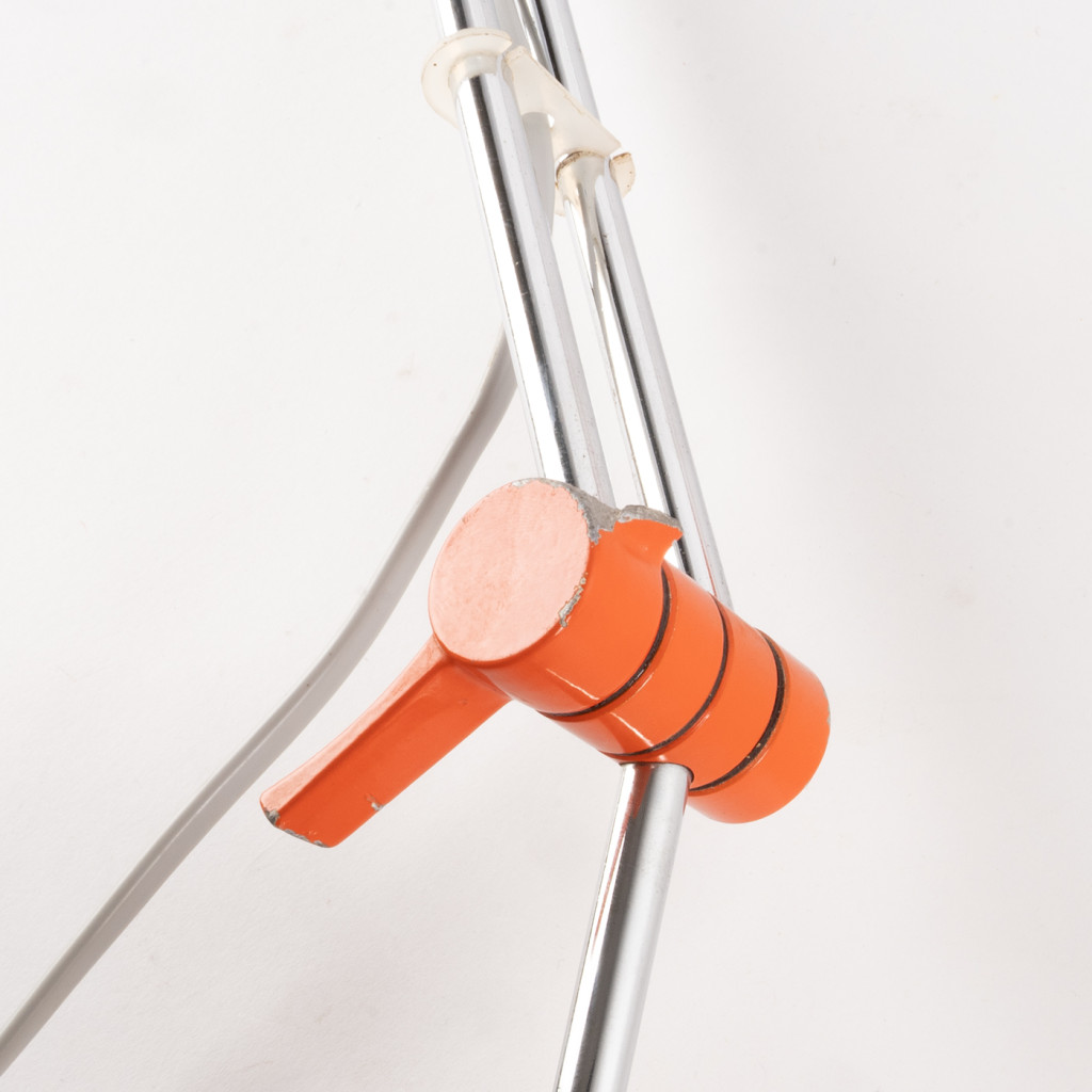 This Napako work lamp was designed in the 1970s by Josef Hůrka, one of the most prominent designers in Czech lighting design. The lamp has an all-metal varnished construction with adjustable joints. It can be easily attached to any table with a simple clamp. The lamp has a rich orange shade, a gray cable with a plastic switch, and shines with one E27 bulb. The lamp is fully functional and in very good original condition. The second part of the lower handle is broken off, but this does not affect its functionality.