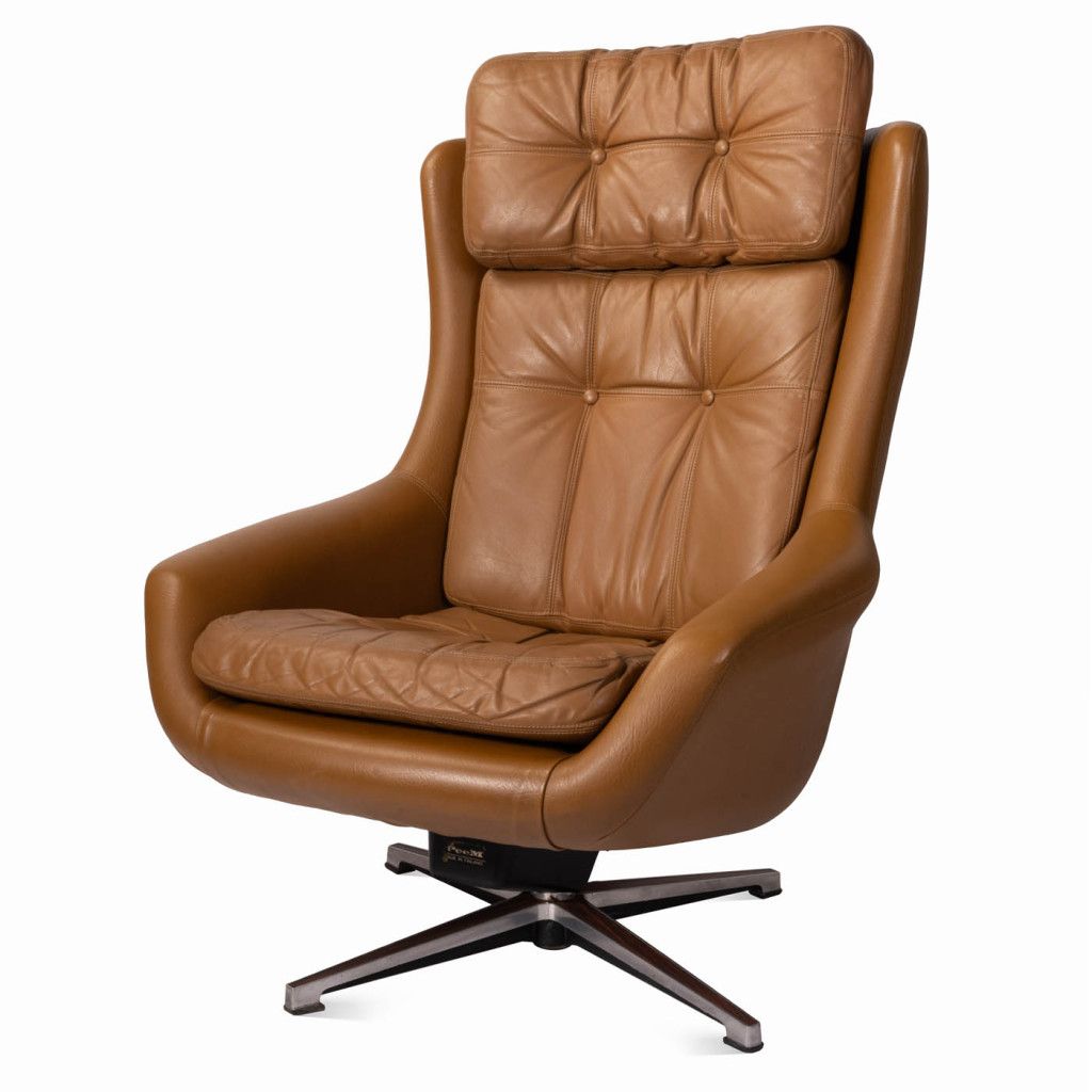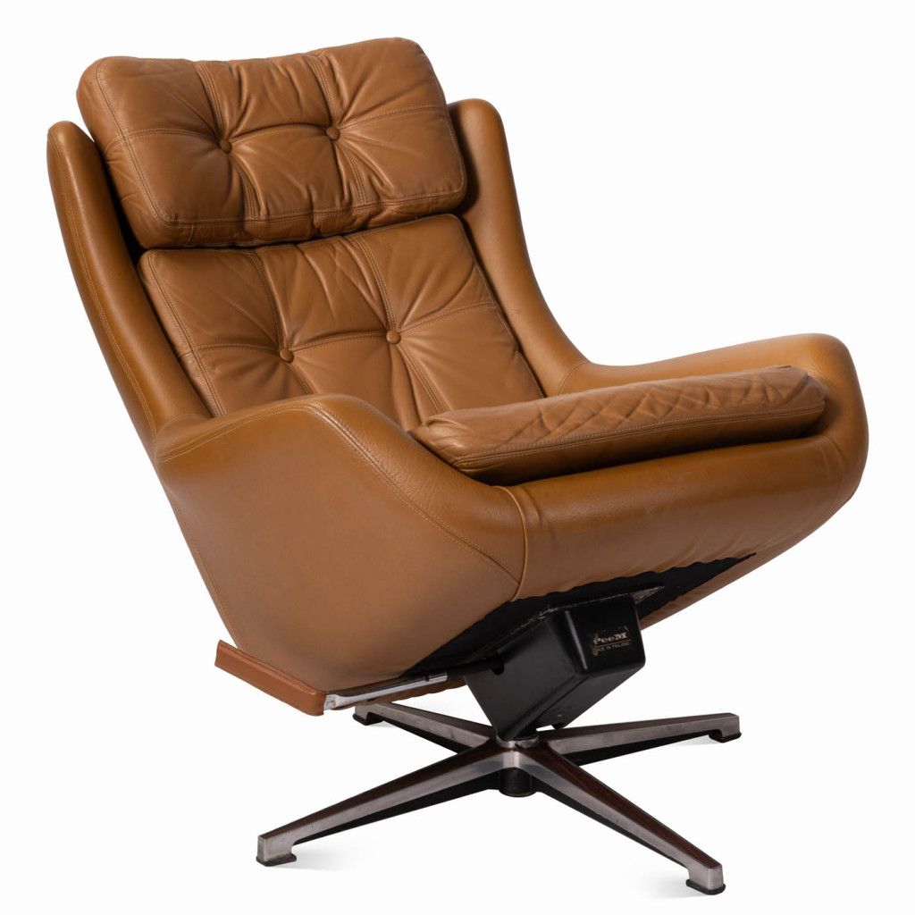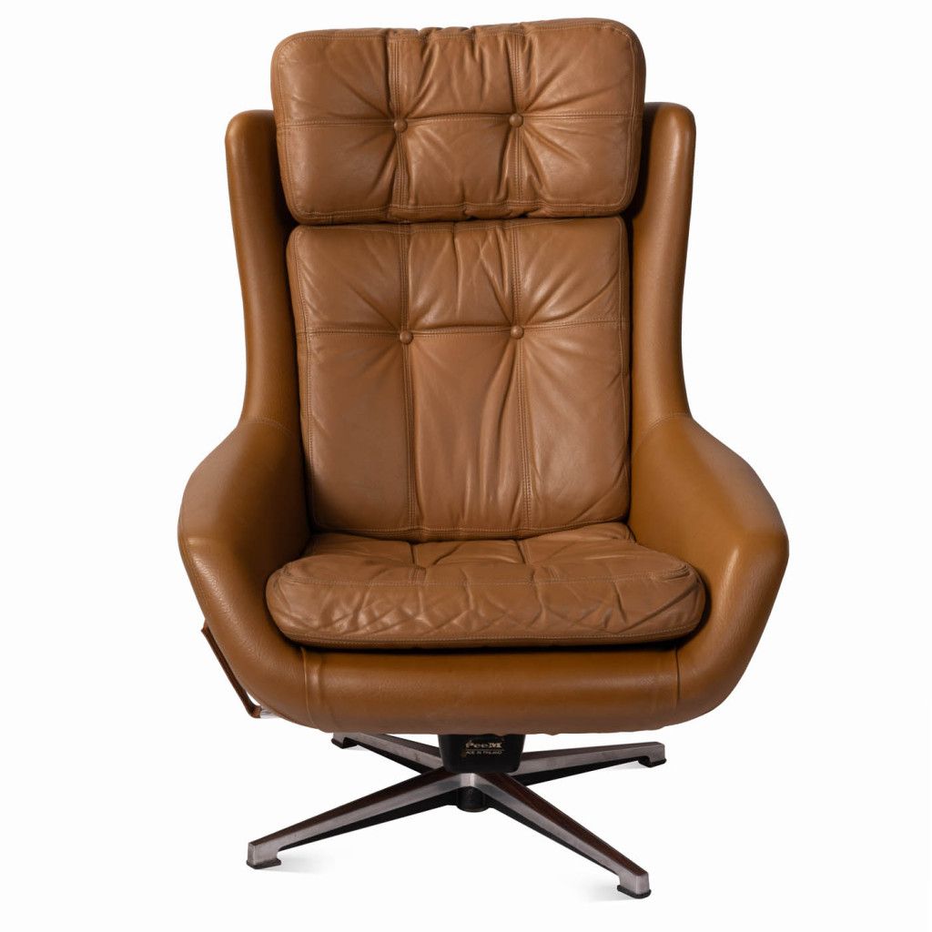 Leather armchair produced by the Finnish company PeeM in the 1970s for the Czechoslovak market, and distributed exclusively through the Tuzex retail chain. It was considered a luxury item at the time, which is why these armchairs are often found in excellent condition today. The armchair has a leatherette frame and three soft, quilted, buttoned cushions upholstered in ochre-coloured genuine leather. The aluminium steel base allows the chair to swivel and recline.