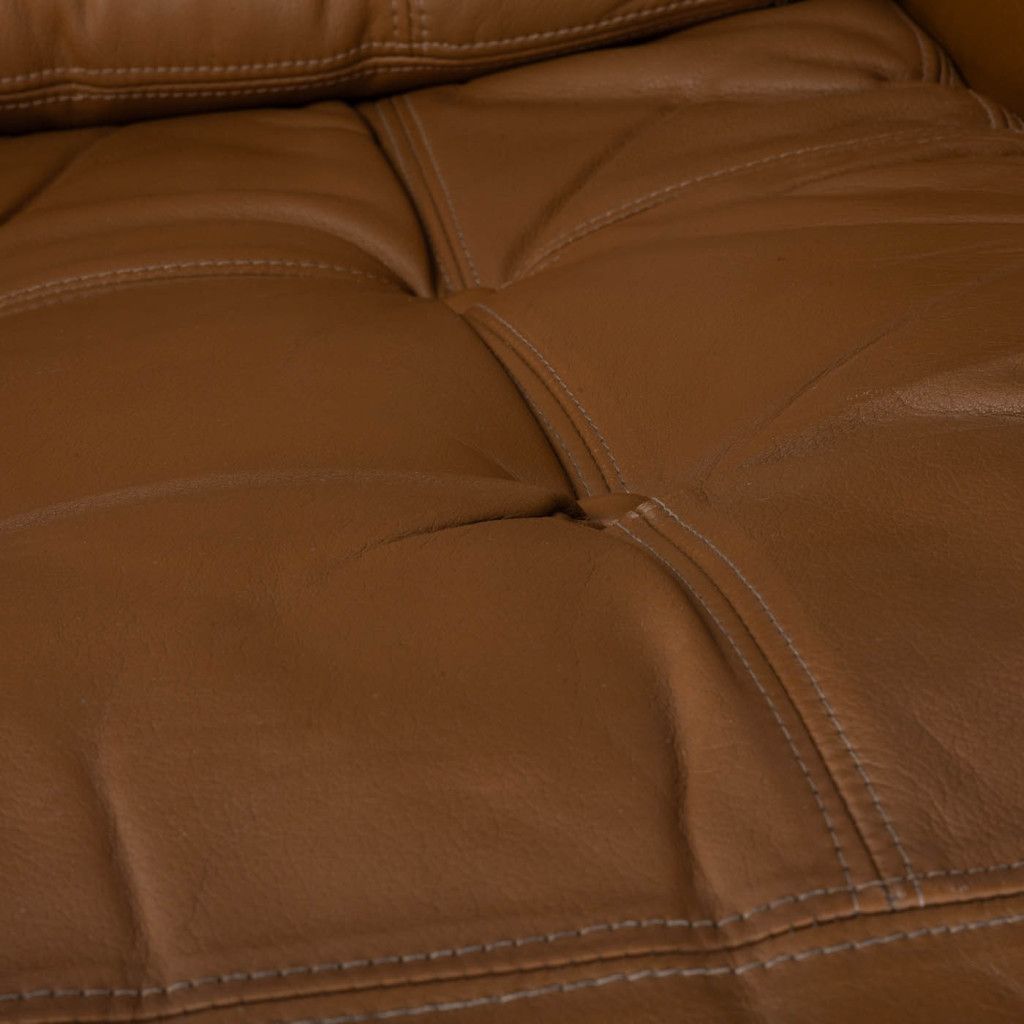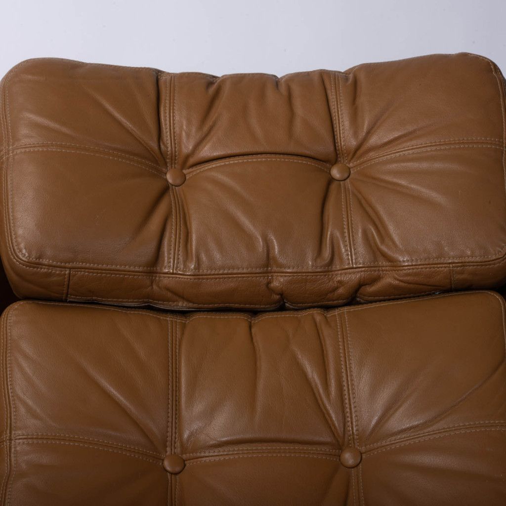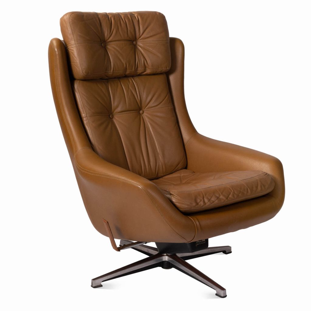 Leather armchair produced by the Finnish company PeeM in the 1970s for the Czechoslovak market, and distributed exclusively through the Tuzex retail chain. It was considered a luxury item at the time, which is why these armchairs are often found in excellent condition today. The armchair has a leatherette frame and three soft, quilted, buttoned cushions upholstered in ochre-coloured genuine leather. The aluminium steel base allows the chair to swivel and recline.