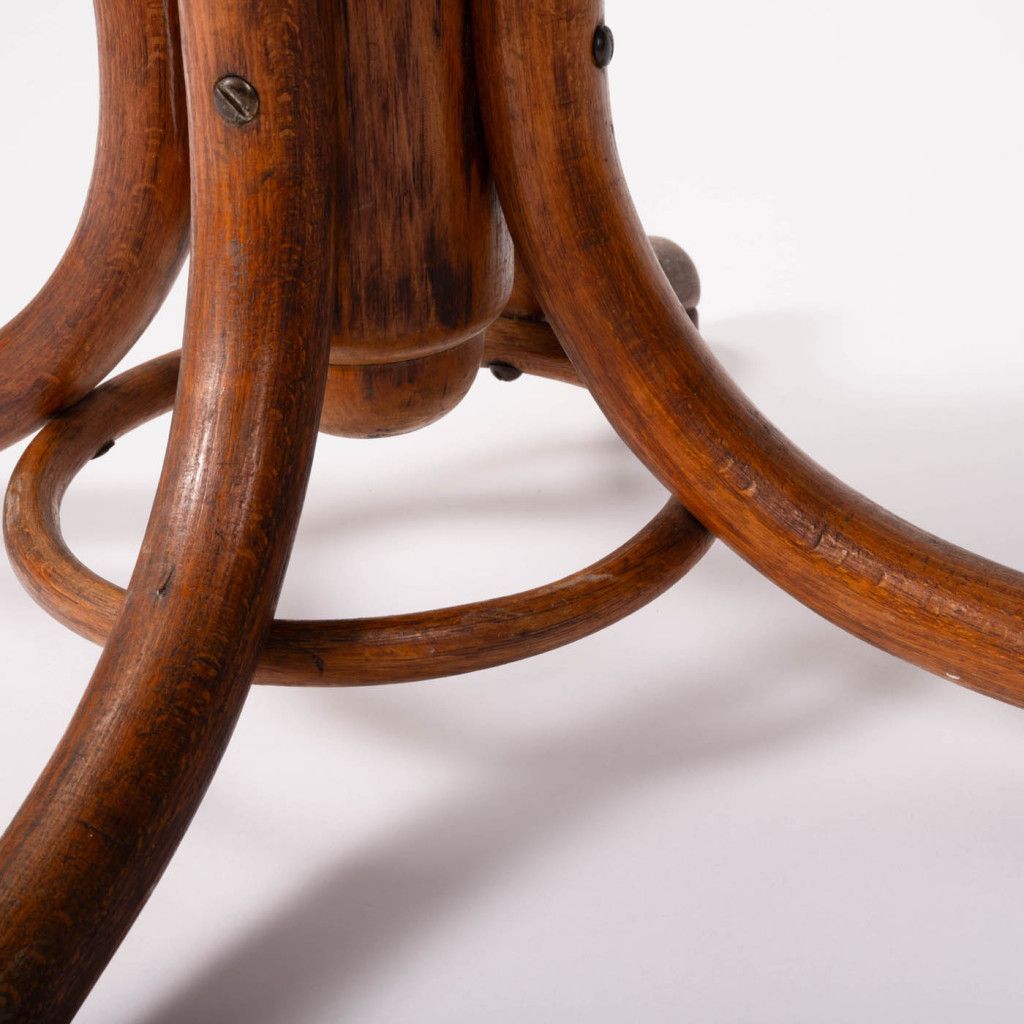 Wooden swivel piano stool in the Thonet style made probably at the turn of the 19th and 20th centuries. The stool is made of bent beech wood with an oak finish and stained a rich brown shade with a matte finish. The top is slightly darker than the other parts. It has elegant lines, a very sturdy construction, and a screw mechanism that allows for seat height adjustment. The stool is in good condition after a partial renovation in our workshop. It has visible patina with water stains, and the wood is scuffed in places, as can be seen in the photos.