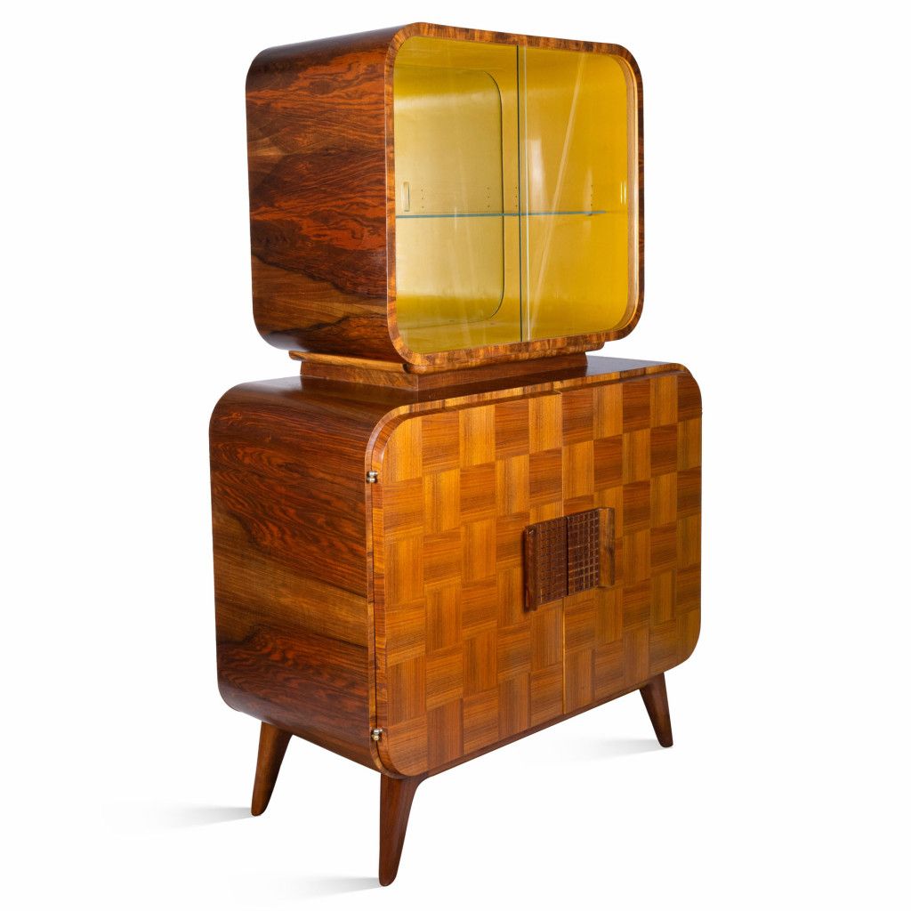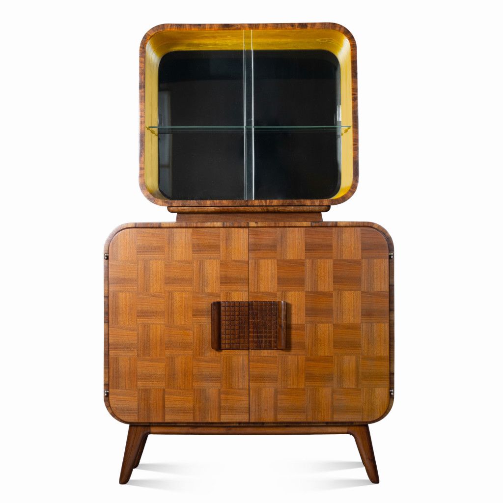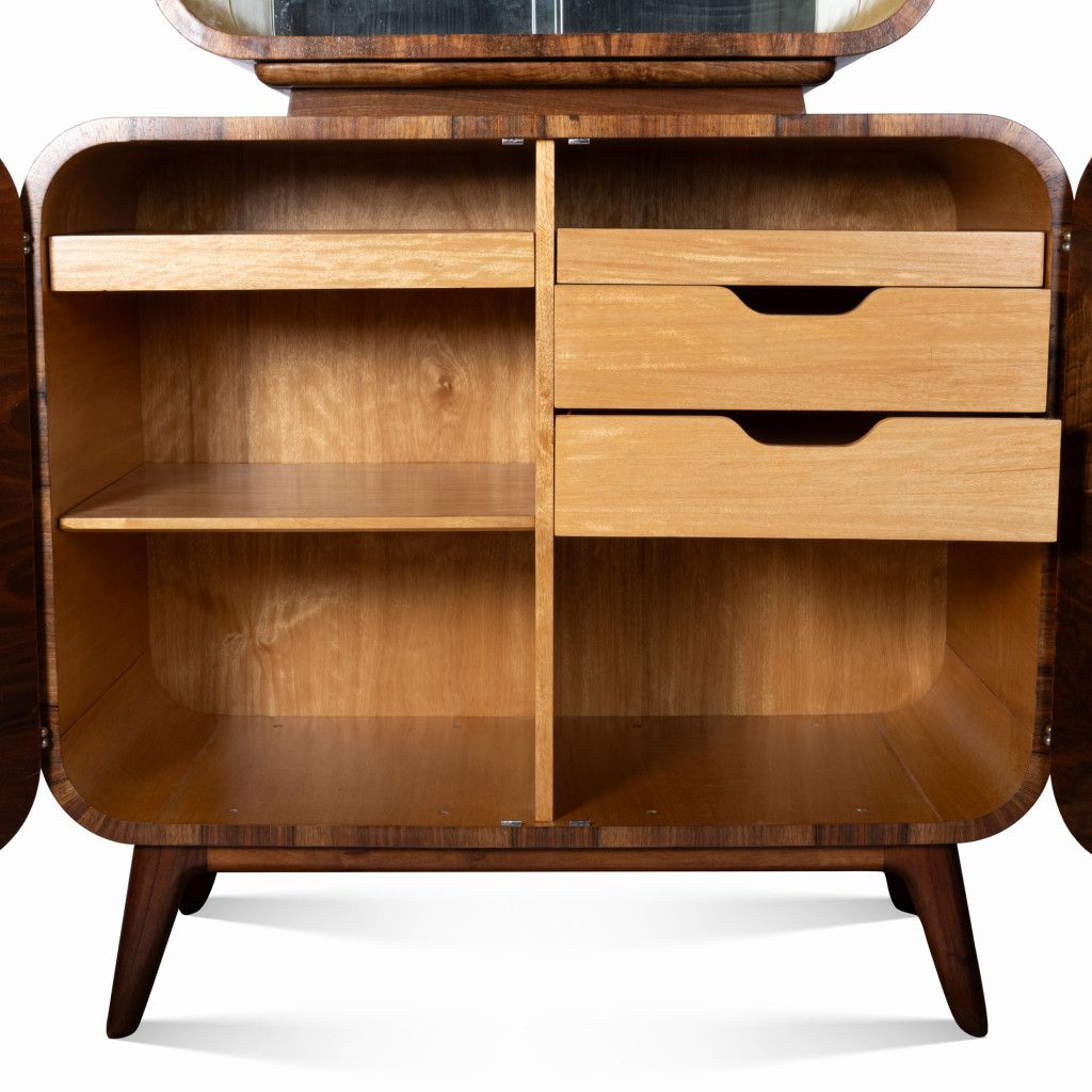 Wooden sideboard with an attached vitrine, also known as a "television", was designed in the 1940s by Jindřich Halabala for the UP závody in Brno. The sideboard is a perfect and relatively rare example of a bridge between two eras. It combines the luxury and ornamentation of the waning Art Deco period with the experimentation and functionality of the emerging modernist movement.