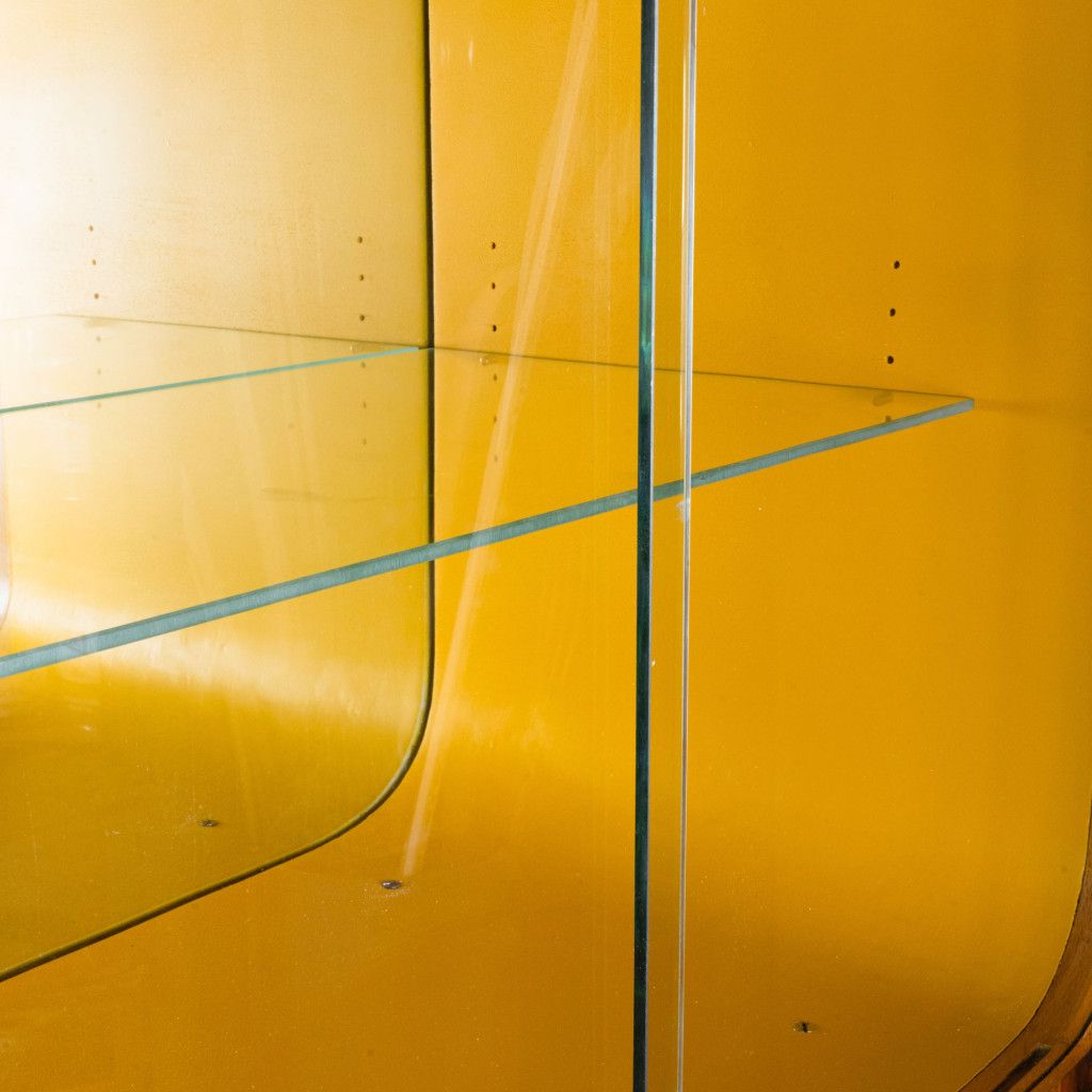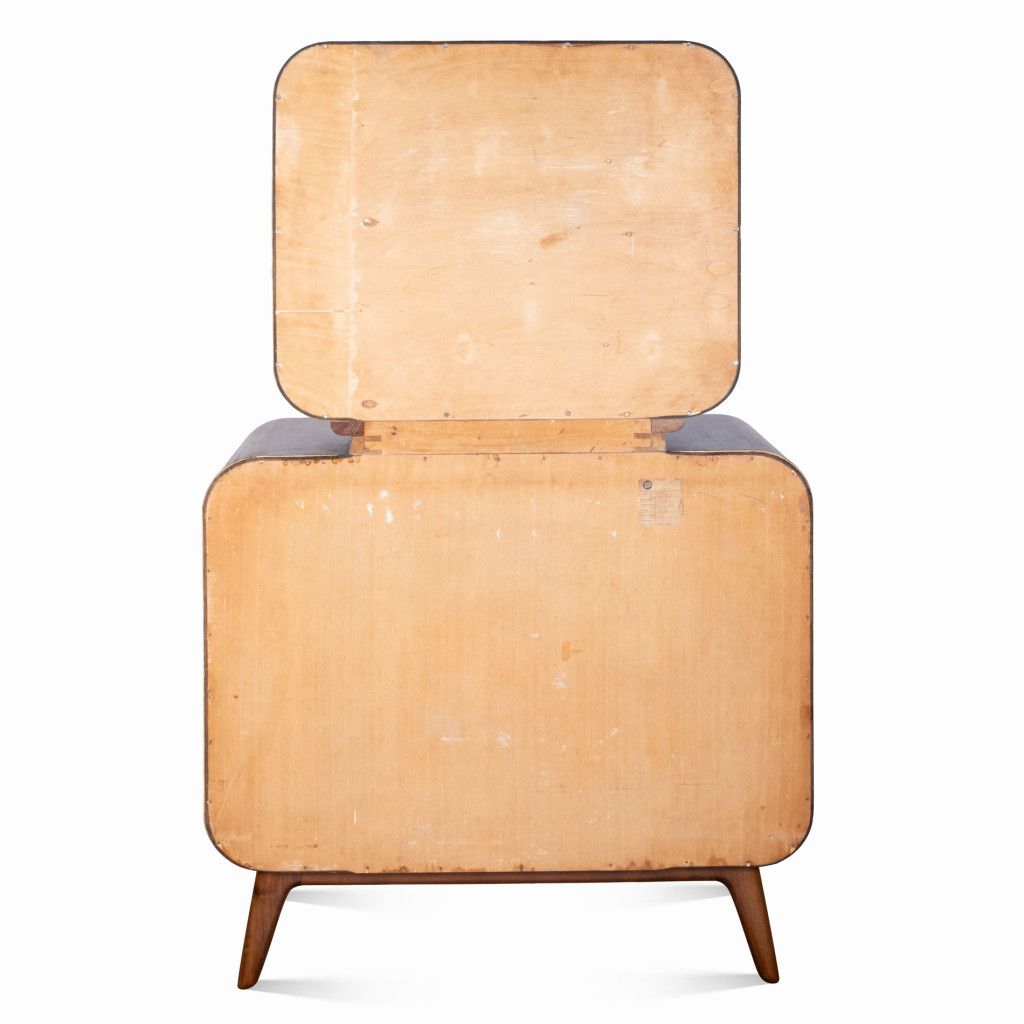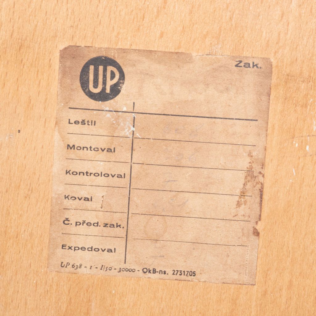 Wooden sideboard with an attached vitrine, also known as a "television", was designed in the 1940s by Jindřich Halabala for the UP závody in Brno. The sideboard is a perfect and relatively rare example of a bridge between two eras. It combines the luxury and ornamentation of the waning Art Deco period with the experimentation and functionality of the emerging modernist movement.