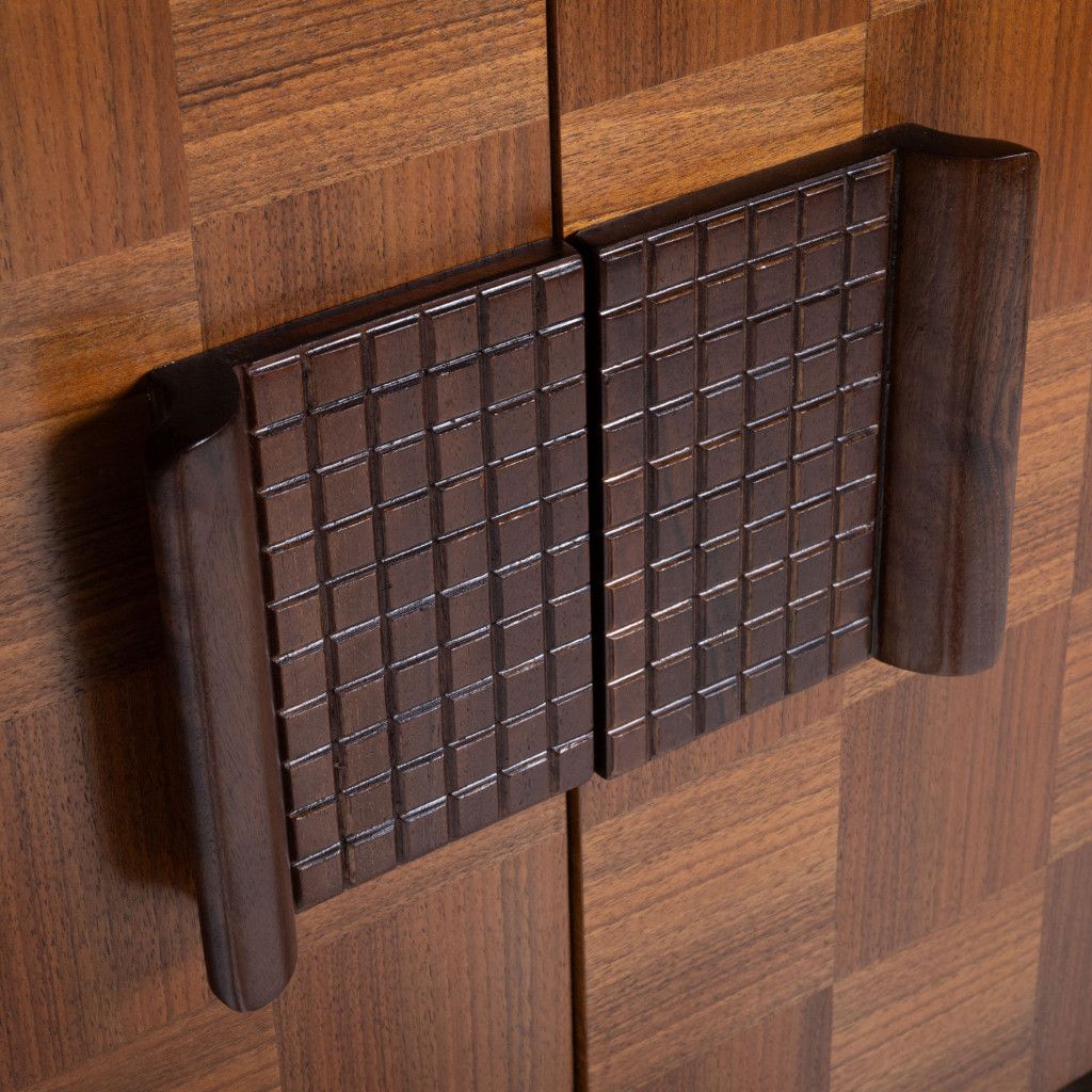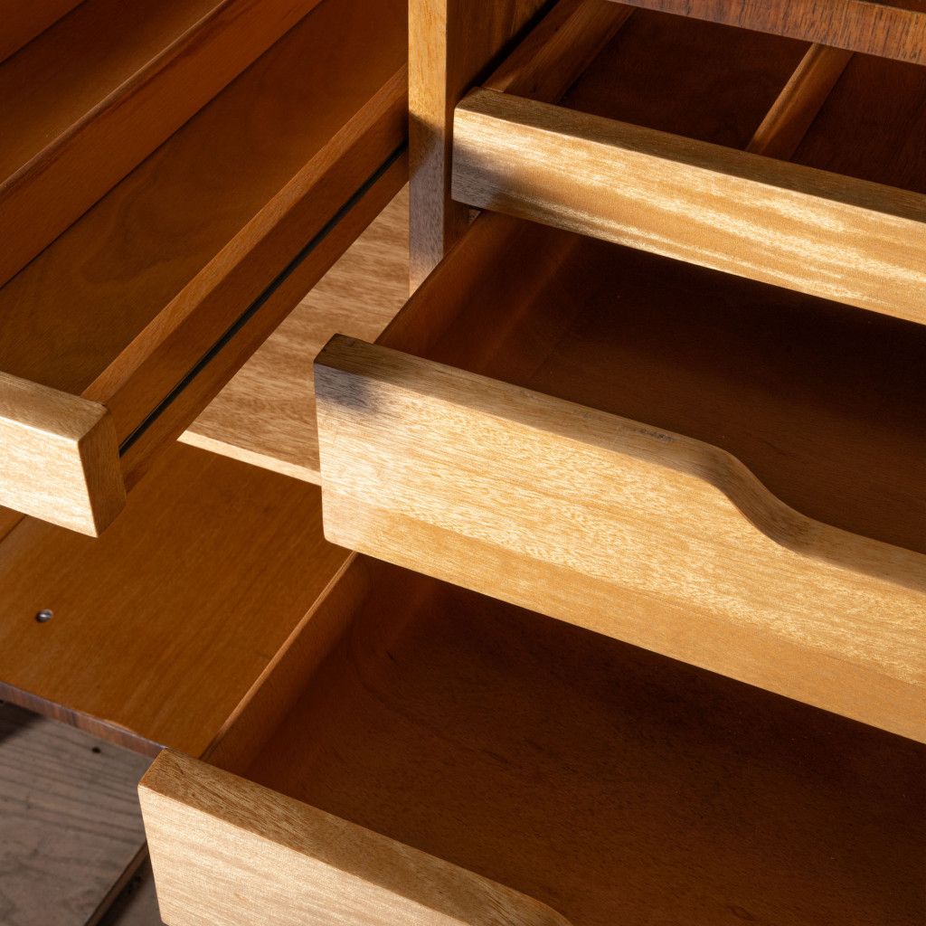 The sideboard consists of two parts. The upper, smaller part has a square shape and features sliding glass doors. Inside, it has a glass shelf; the back is covered by a mirror, and the walls are painted a rich yellow. It sits atop the lower, larger rectangular part, which contains a system of various drawers and storage shelves. This sturdy sideboard has rounded edges and a body made of solid walnut and veneer. The other parts are made of beech wood. The surface is stained in a rich brown to rusty shade with a matte finish and contrasting elements in dark brown. The inner parts of the sideboard are light in color. It has a beautiful wood grain; the front is veneered in a checkerboard pattern with a unique handle shaped like a chocolate bar. The sideboard is in excellent condition after a complete renovation in our workshop.