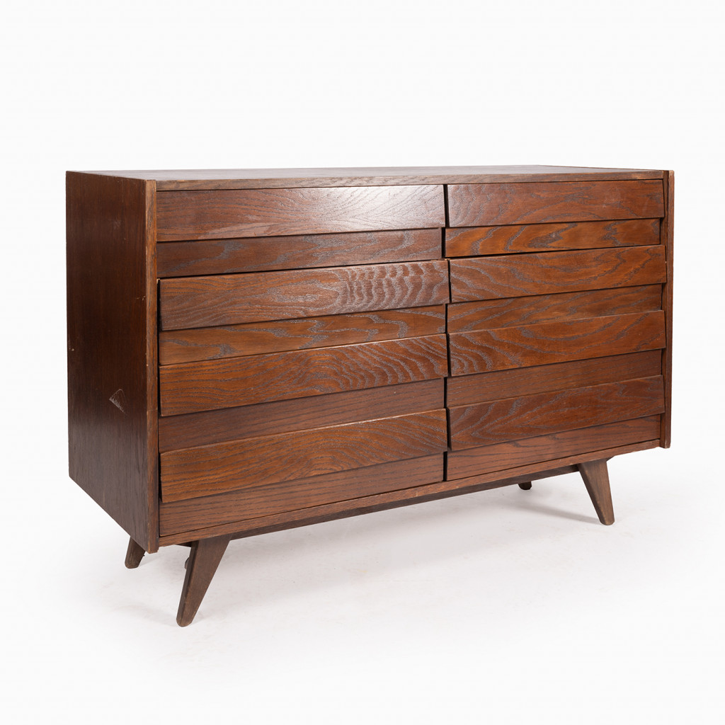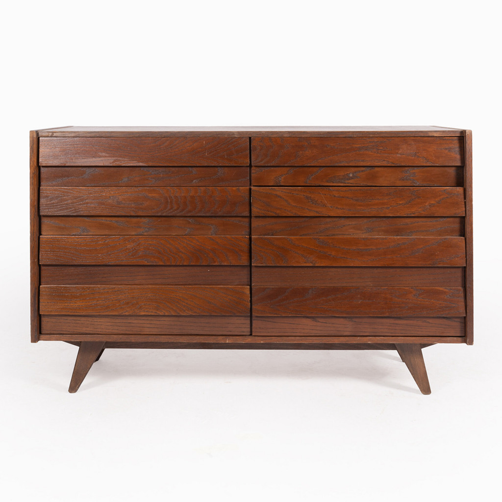 The chest of drawers is part of the famous Universal series (U-450) designed in 1958 by Jiří Jiroutek for the Czechoslovak national company Interiér Praha.