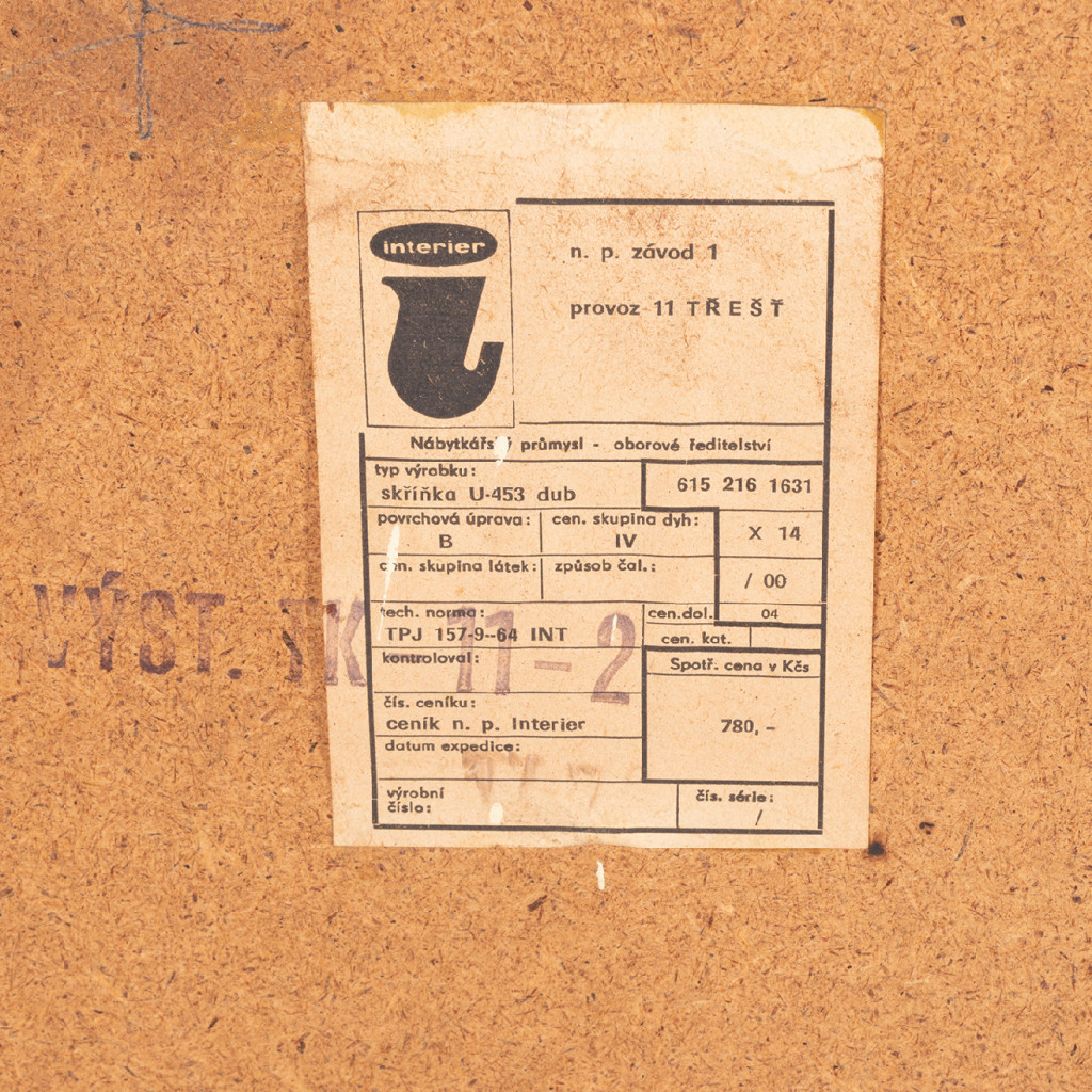 The U-453 cabinet is suitable for any room, it is compact and relatively light, so it is easy to handle. The cabinet has eight drawers and a veneered (oak) finish. The base is solid spruce. We have consulted Jiří Jiroutek, from whom we also have the exclusive right to renew the production of the entire U-450 series since 2018.