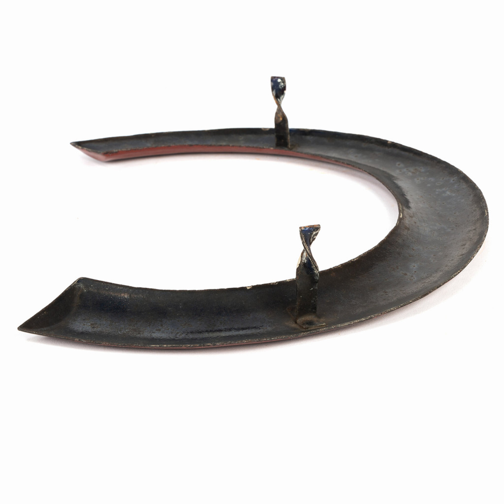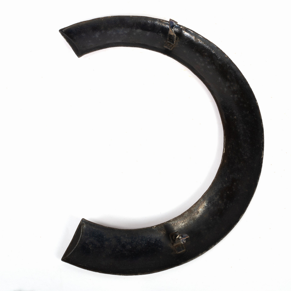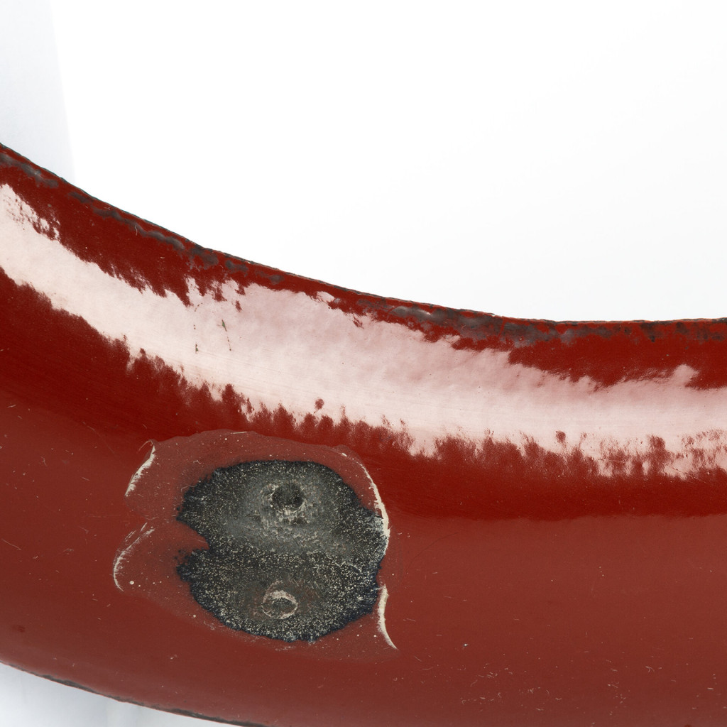 An enamelled letter originally from a notice board. It is painted dark red, but the paint is damaged in some places. The original bracket on the back side is also damaged.
