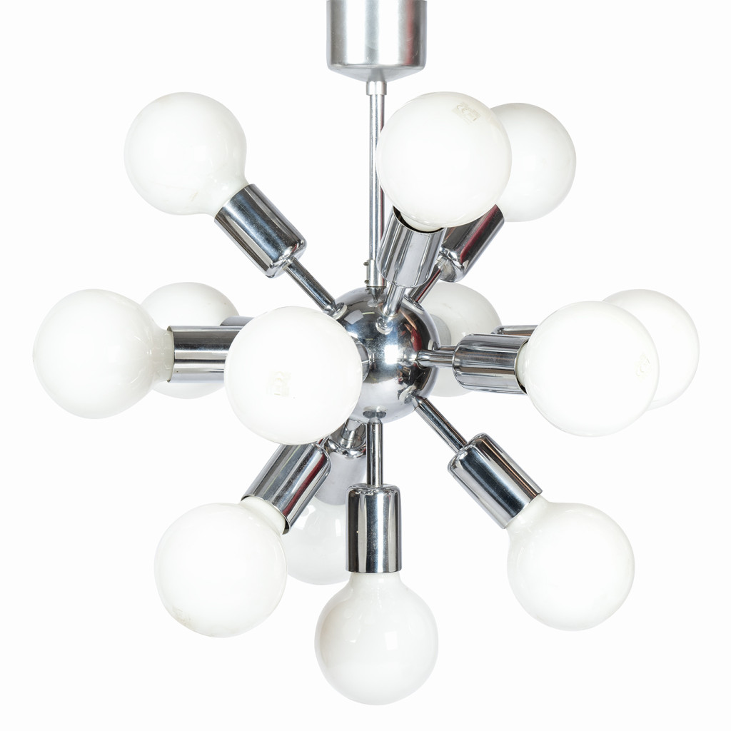 Futuristic metal chandelier type 21418 nicknamed "Sputnik", produced by the Czechoslovak company Drupol in the 1970s. Drupol was founded in 1935 and originally specialized mainly in the production of agricultural tools, which is where its name comes from – an abbreviation of the words 'družstvo polního nářadí' (agricultural tools cooperative). Later, it expanded its activities to include woodworking and metalworking and became famous for its electrical appliances and lighting technology.