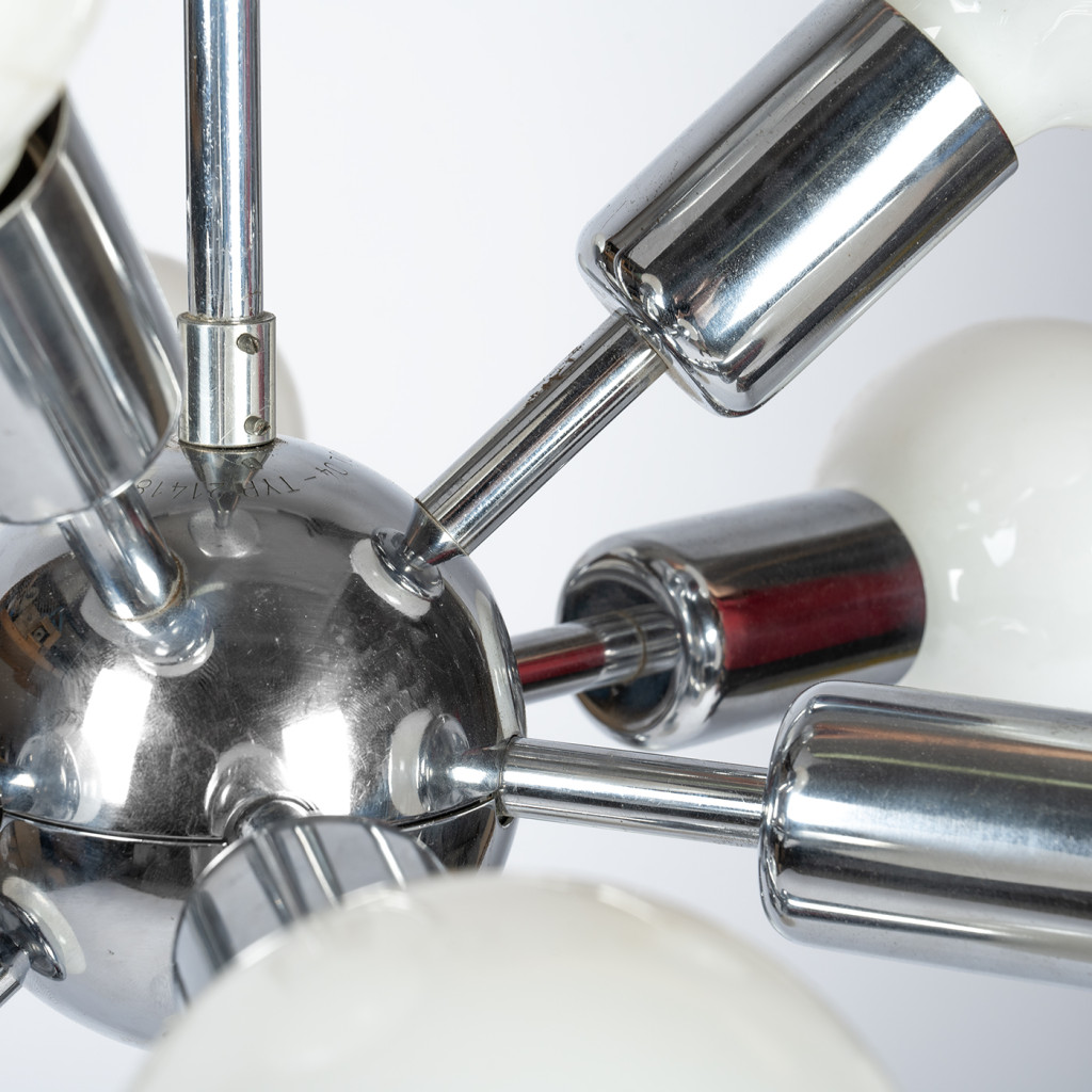 The design of the Sputnik chandelier is inspired by space objects – especially the Sputnik 1 satellite. This type was produced in several variants, which differed in the number and length of the arms or the material used. Thirteen arms sprout from the central spherical base, illuminated by milk glass bulbs with E27 250V/40W sockets.