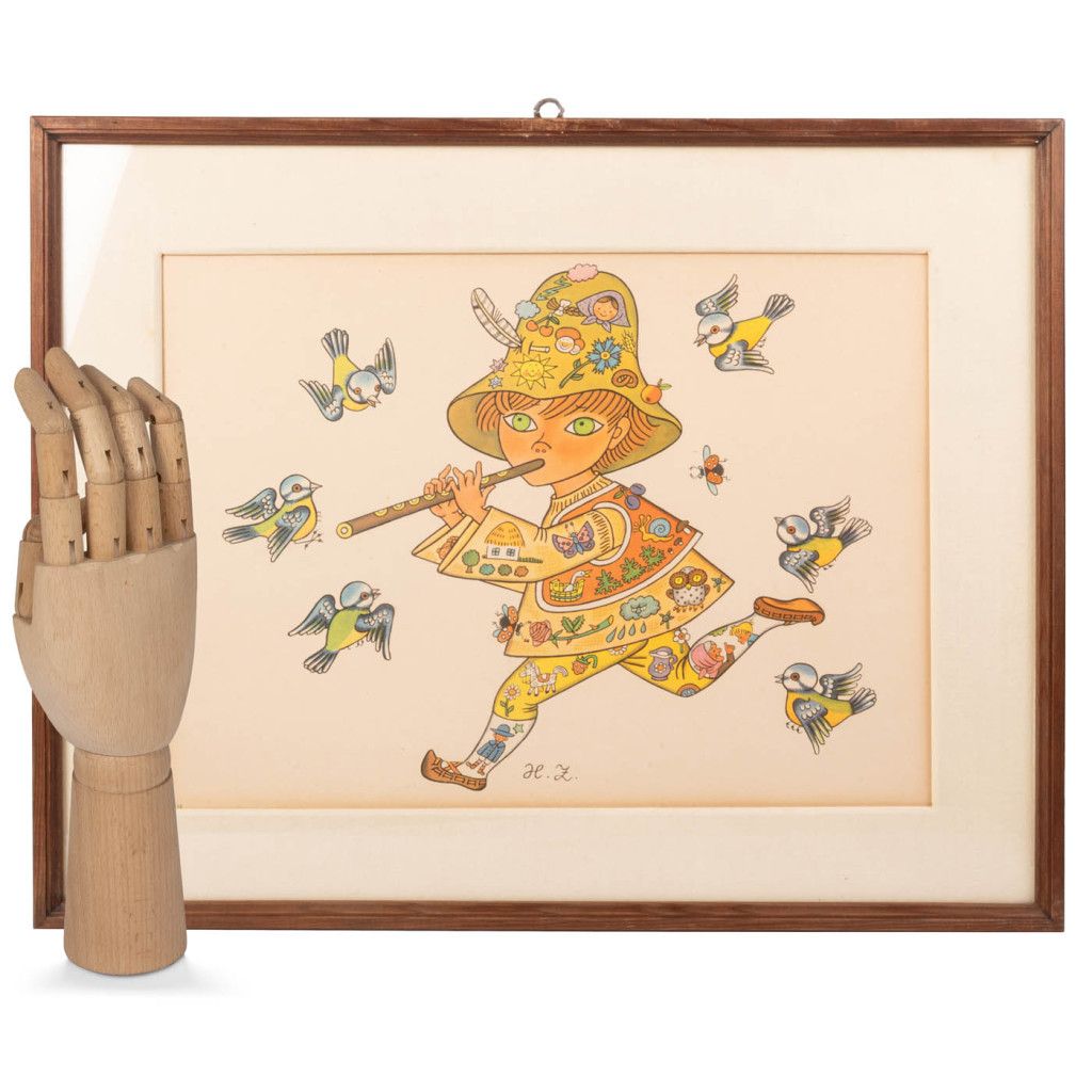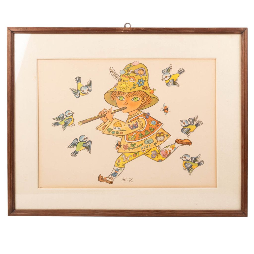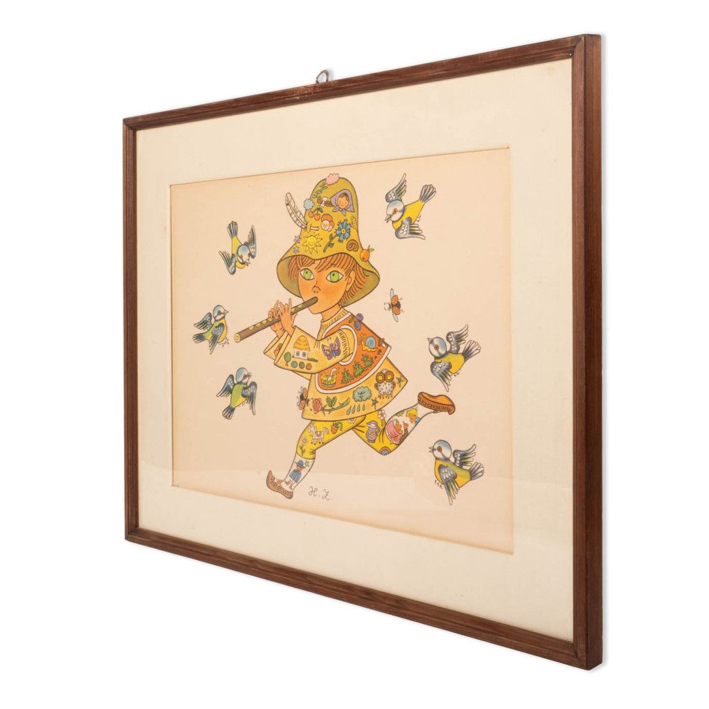 Original print by Helena Zmatlíková from 1968, depicting a boy as an allegory of summer. This print is part of a series depicting the four seasons, which you can also find in our selection. The print is framed in a brown wooden frame with a cream-coloured mountboard and hanging loop. It is in very good original condition. The frame is only slightly scuffed, with a torn cardboard on the reverse.