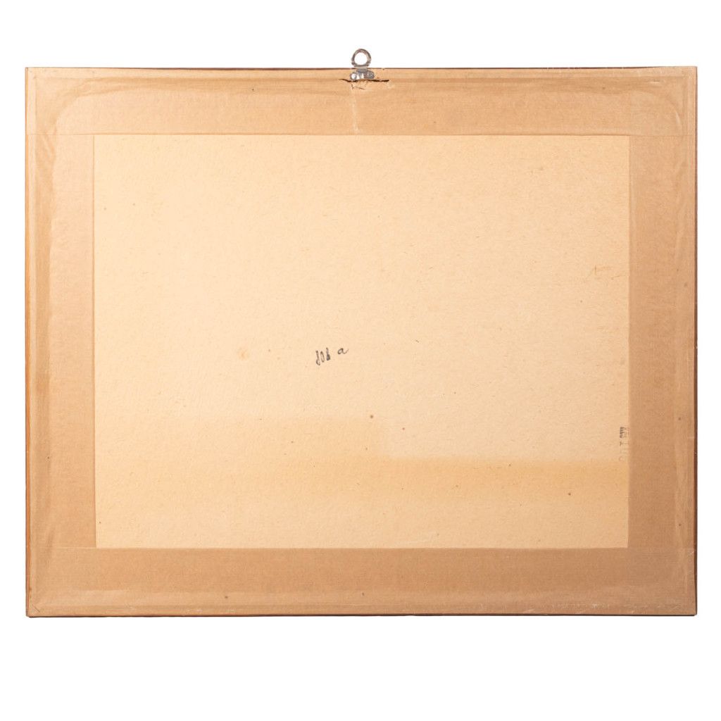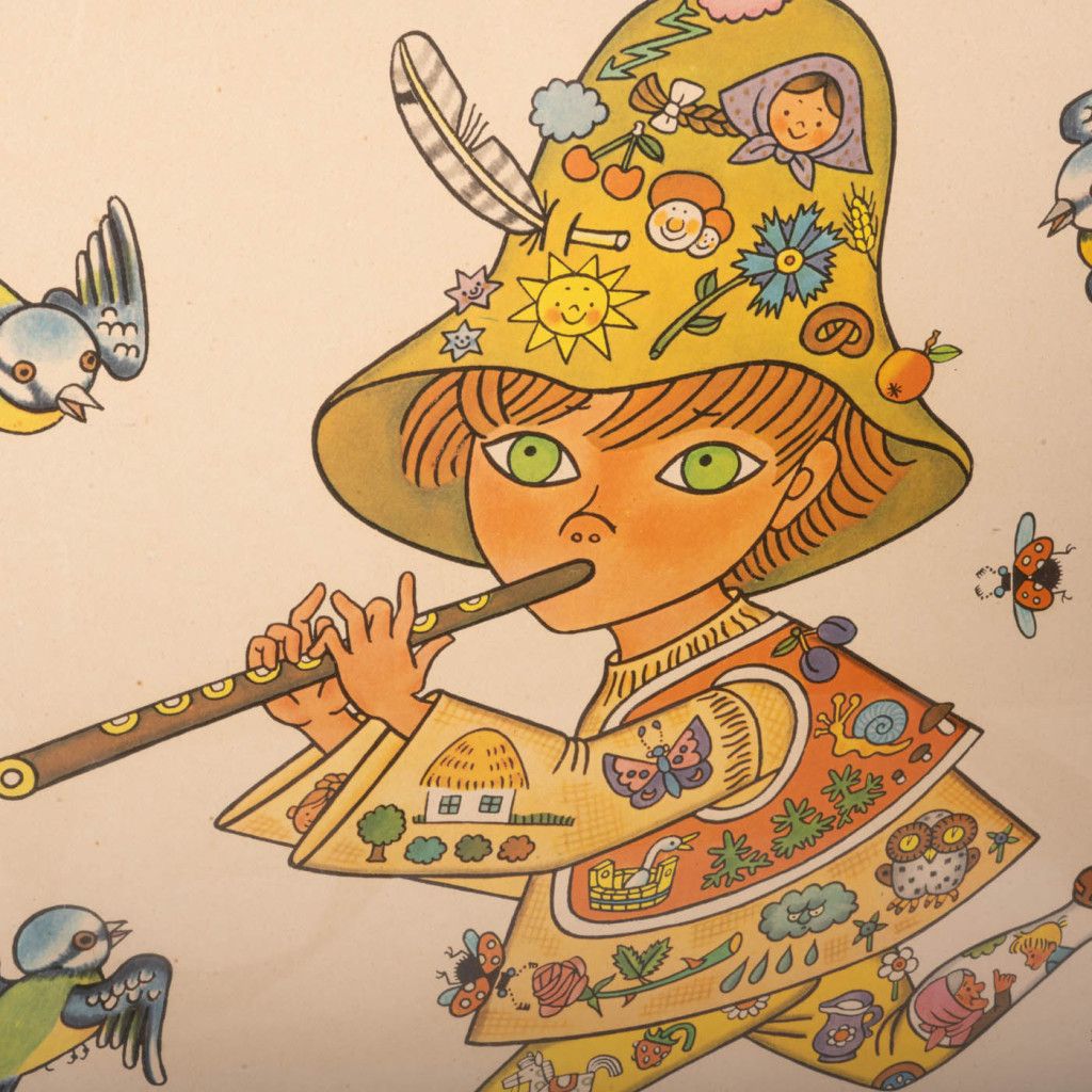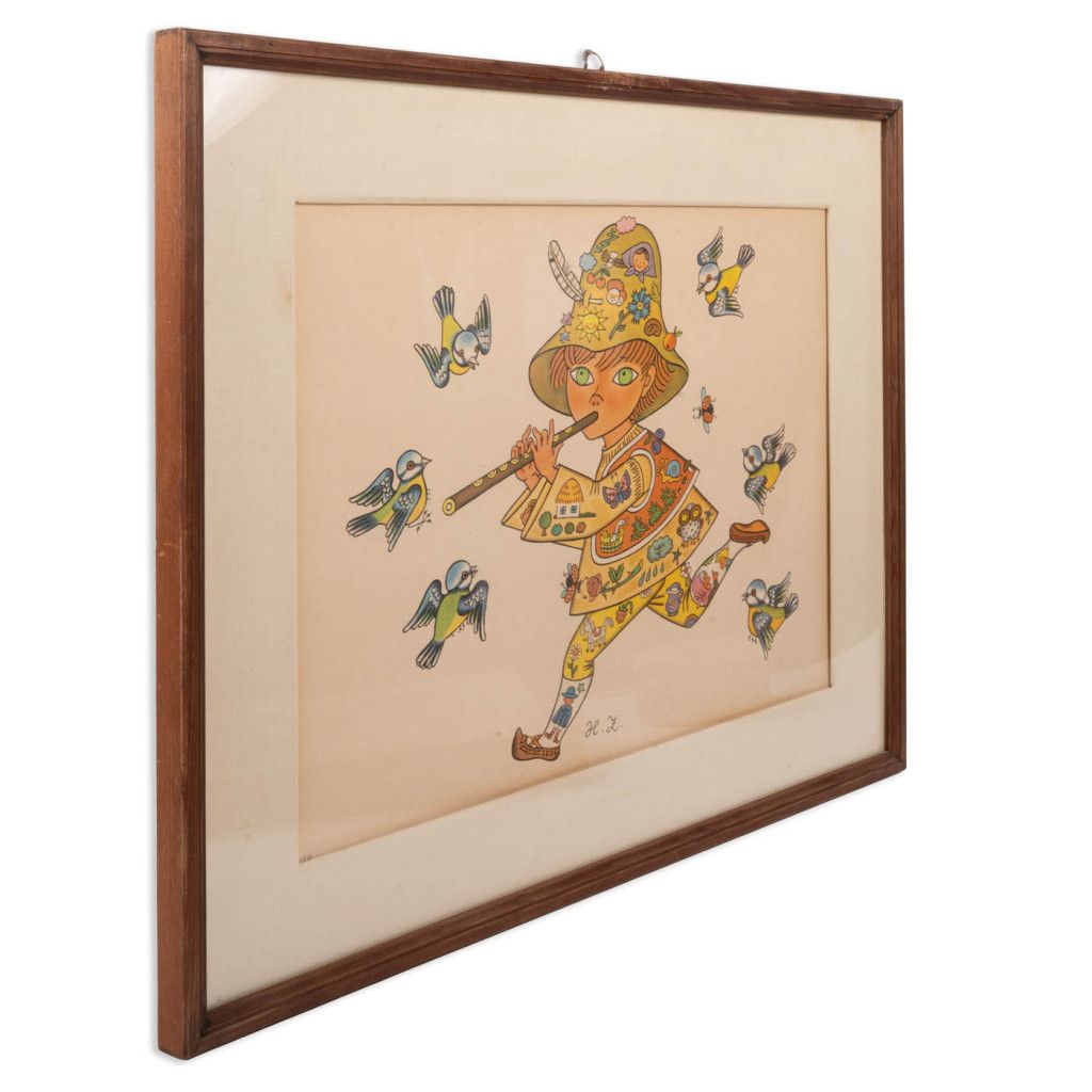 Original print by Helena Zmatlíková from 1968, depicting a boy as an allegory of summer. This print is part of a series depicting the four seasons, which you can also find in our selection. The print is framed in a brown wooden frame with a cream-coloured mountboard and hanging loop. It is in very good original condition. The frame is only slightly scuffed, with a torn cardboard on the reverse.