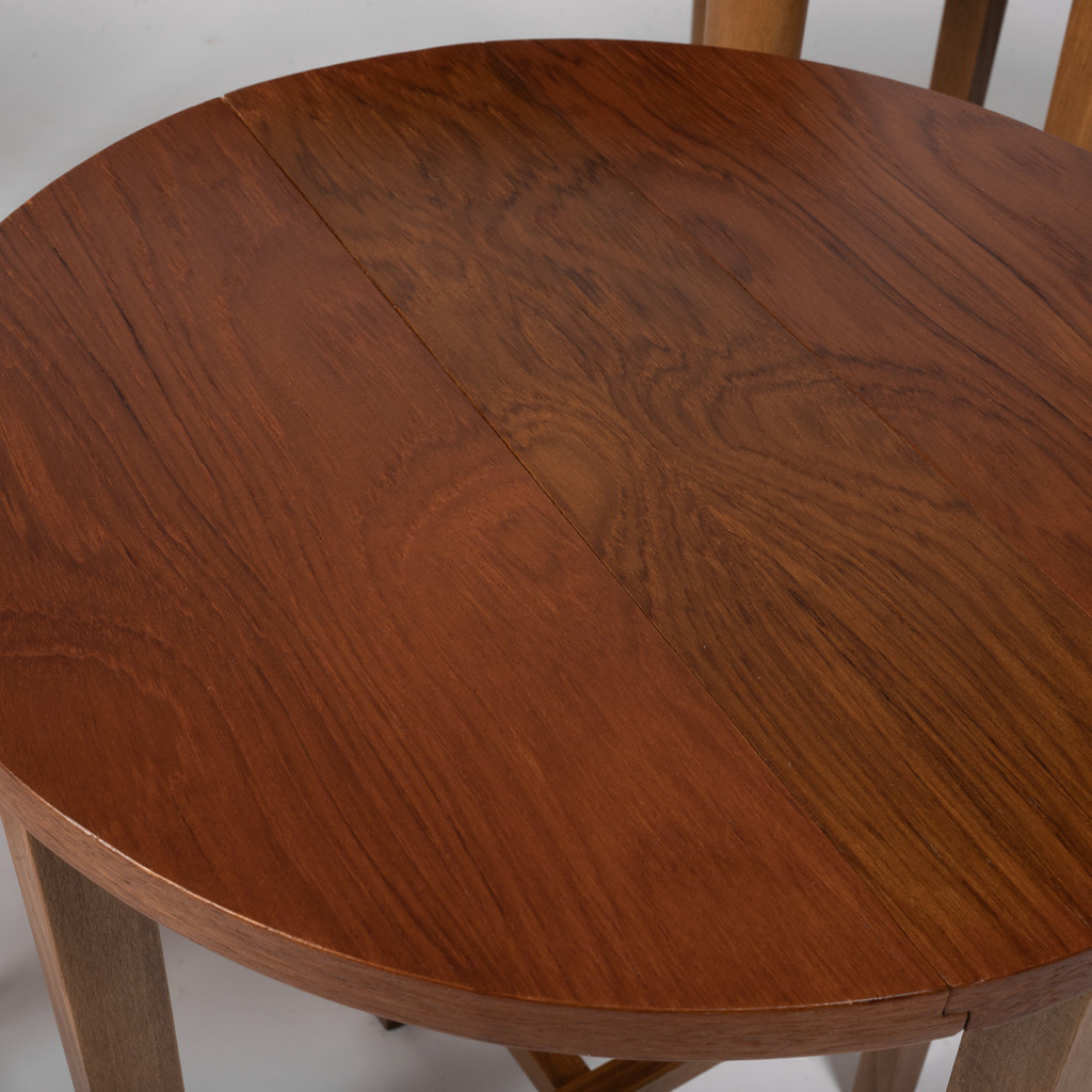 The set is made of teak wood stained in a rusty shade with a matte finish. The stools can be folded and stored under the tabletop to save space. The table has metal wheels and is mobile. The set is in great original condition and has only slight scratches, which can be seen in the photos