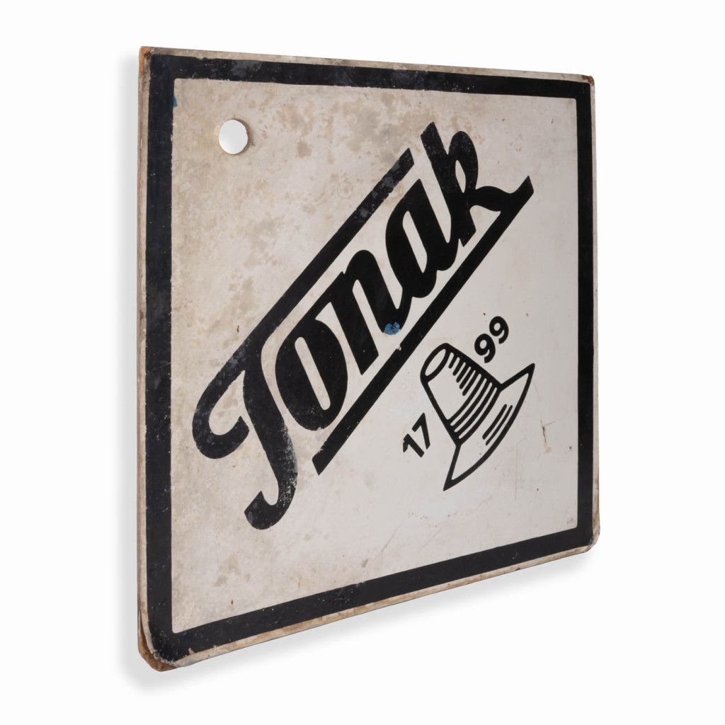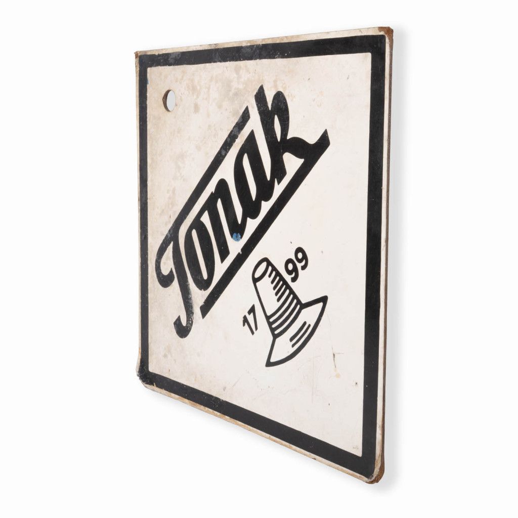 Original advertising sign of the Tonak hat company from the 1960s. The name is derived from the abbreviation of the Czech words 'TOvárna NA Klobouky' meaning 'Hat Factory'. The brand's history dates back to 1799, and it remains a world leader in its field to this day. The sign is made of MDF board covered with paper and has a hole for hanging. It is in good original condition with a visible patina, as can be seen in the photos.