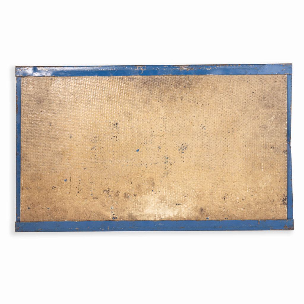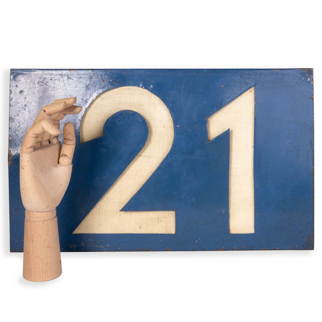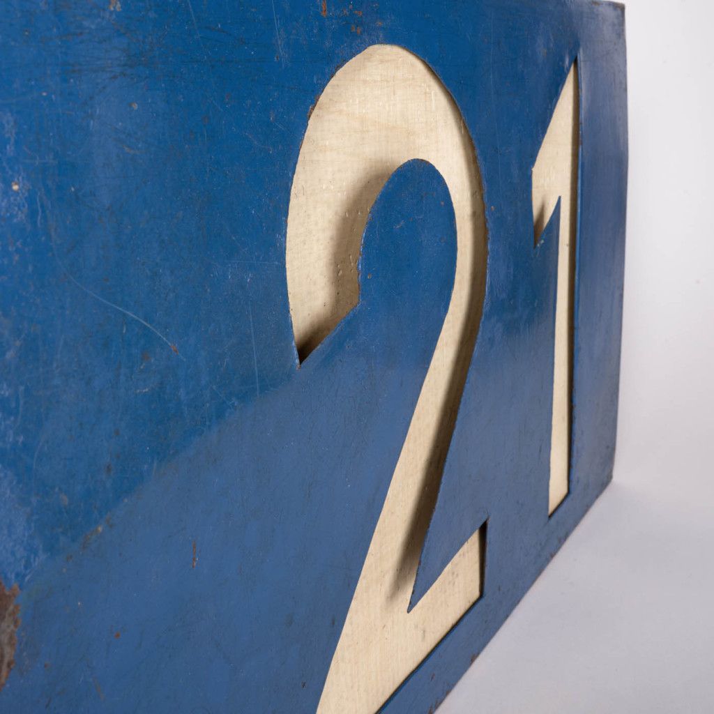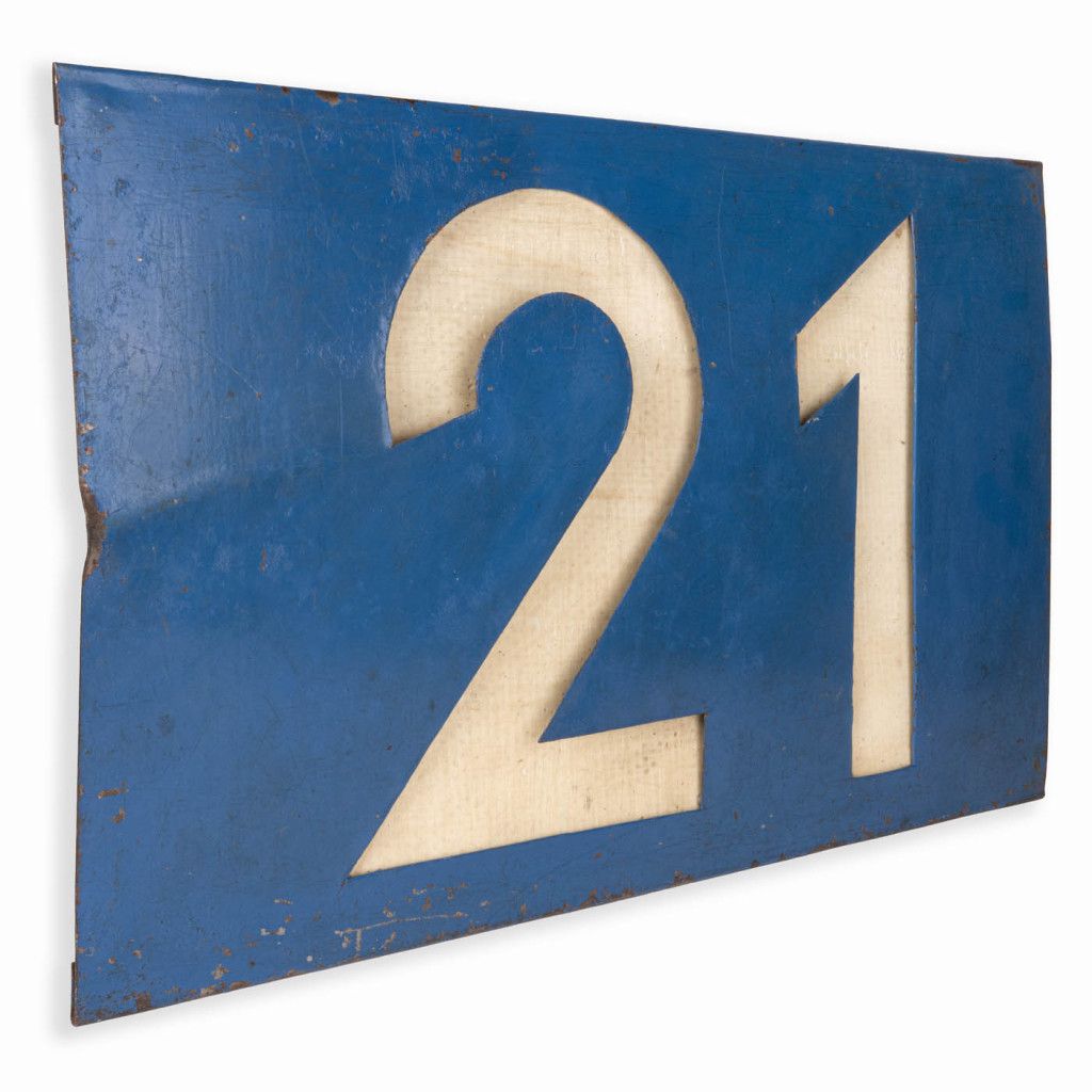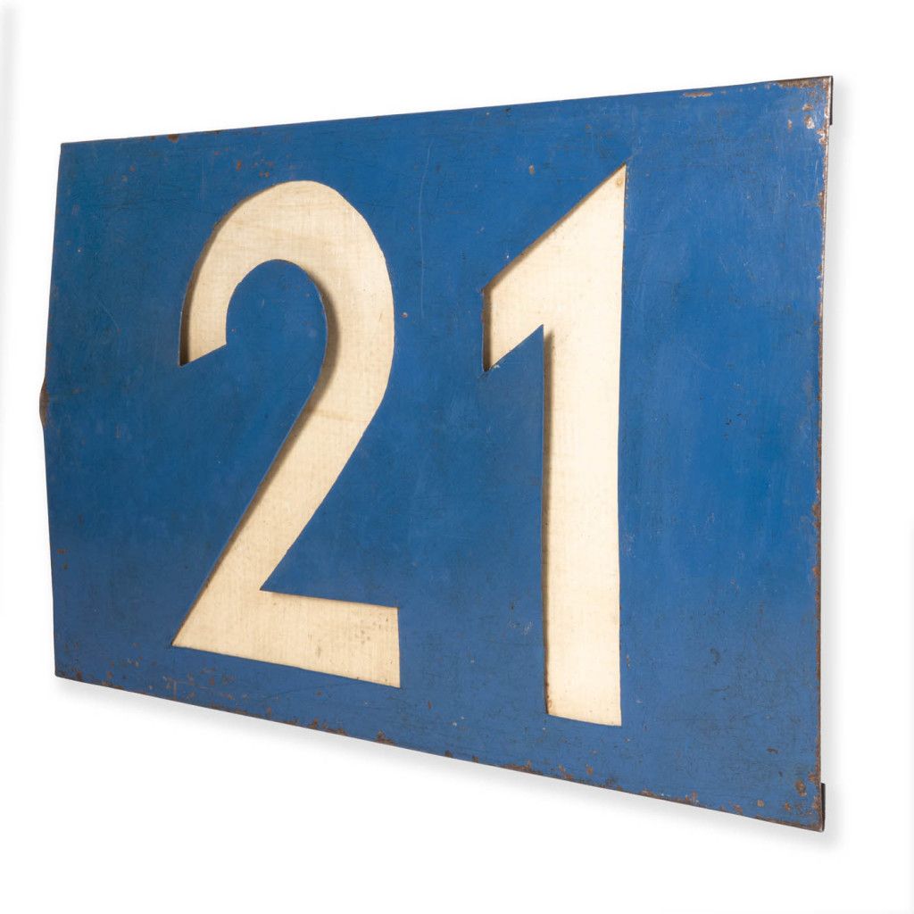 Original sign from the old Czechoslovak tram line No. 21 from the 1980s. It is comprised of a light-coloured panel set into a blue metal plate with a cut-out for the number. The sign is in good original condition with a visible patina, as can be seen in the photos. The metal is slightly warped and has various scratches.