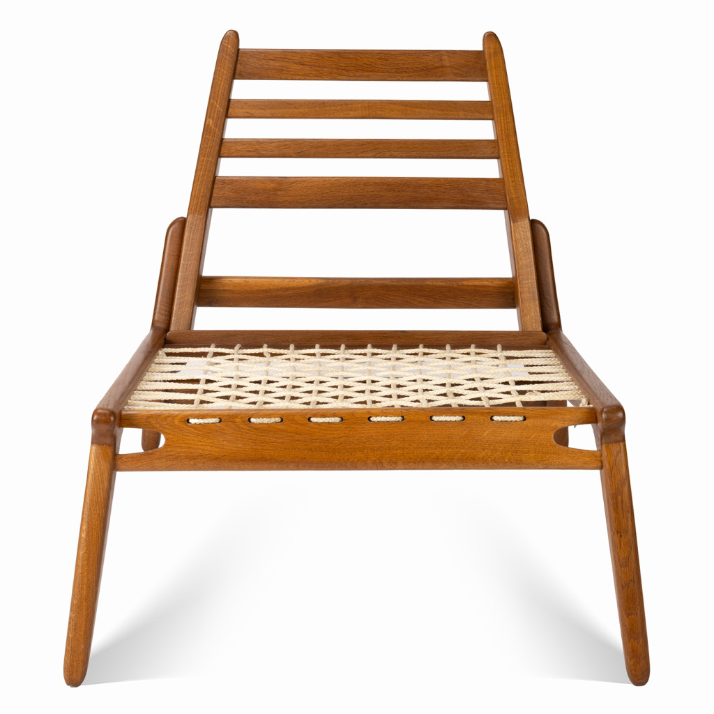 Wooden armchair by the East German furniture manufacturer VEB möbelwerk Naumburg. The low, relaxing armchair has a solid oak construction, the seat is woven with a strong rope, the armrest is reinforced with cross slats.