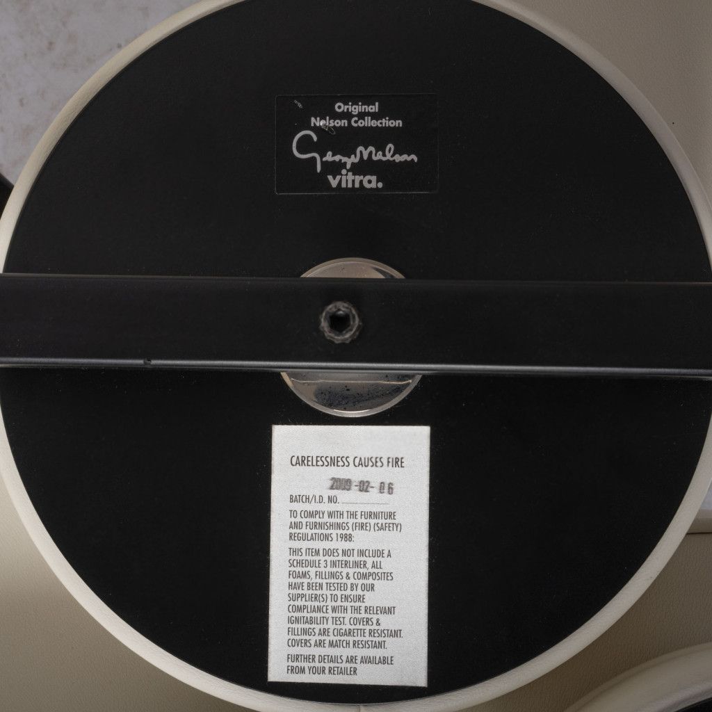 This specific piece was manufactured in 2009 by the Swiss company Vitra, which holds the license for Nelson's designs for the European market. This is the rarer cream-colored version; the sofa is also widely known in a multicolored variant. It consists of two smaller sofas and connectors, which allow both pieces to be easily joined into one larger sofa. The frame is made of black lacquered tubular steel, upon which thirty-nine cushions upholstered in high-quality leather appear to visually levitate. The edges of the round cushions are decorated with piping, and the cushions themselves can be rotated. Despite its purely geometric design, the sofa is highly comfortable. It is in excellent original condition, with only one cushion showing a minor scratch, as can be seen in the photographs.