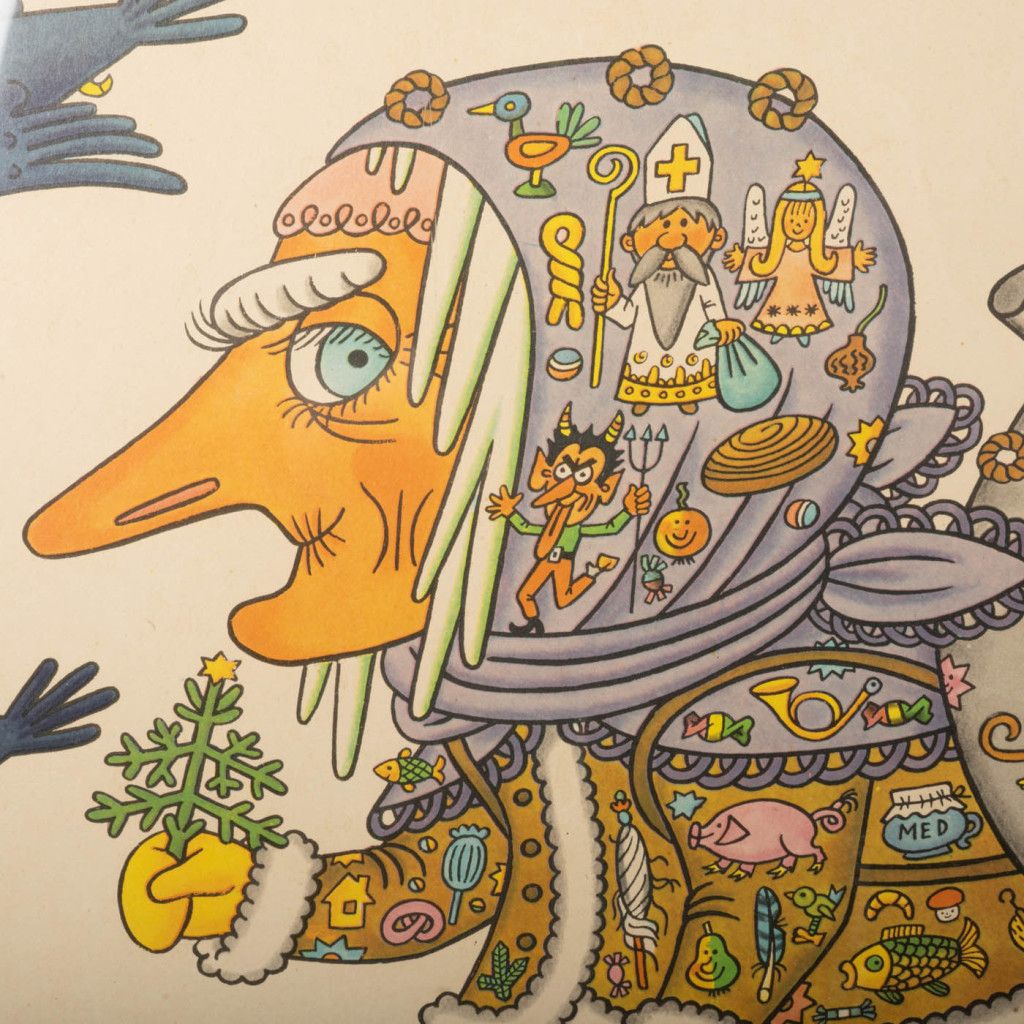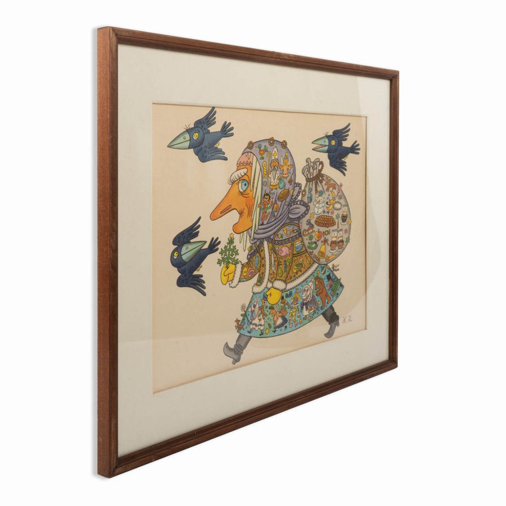 Original print by Helena Zmatlíková from 1968, depicting an old lady as an allegory of winter. This print is part of a series depicting the four seasons, which you can also find in our selection. The print is framed in a brown wooden frame with a cream-coloured mountboard and hanging loop. It is in very good original condition. The frame is only slightly scuffed and has minor water marks on the back.