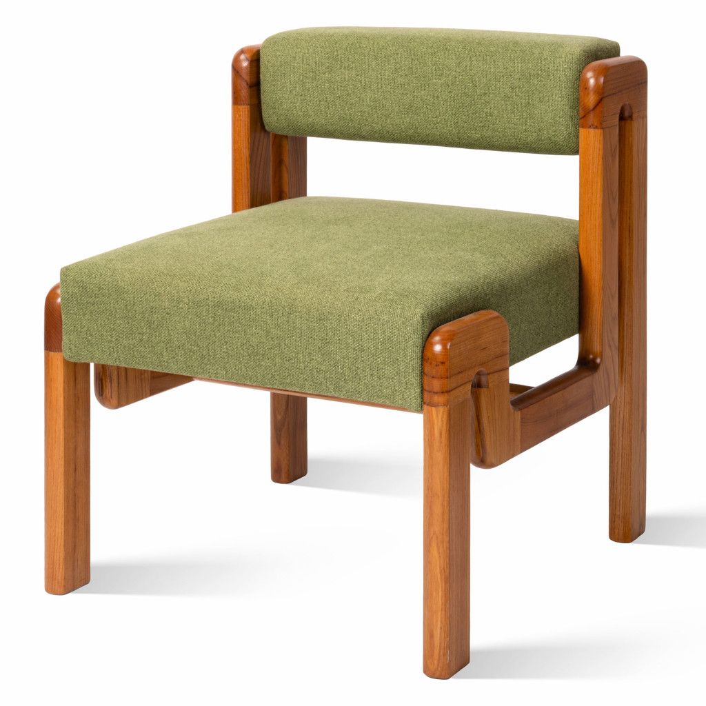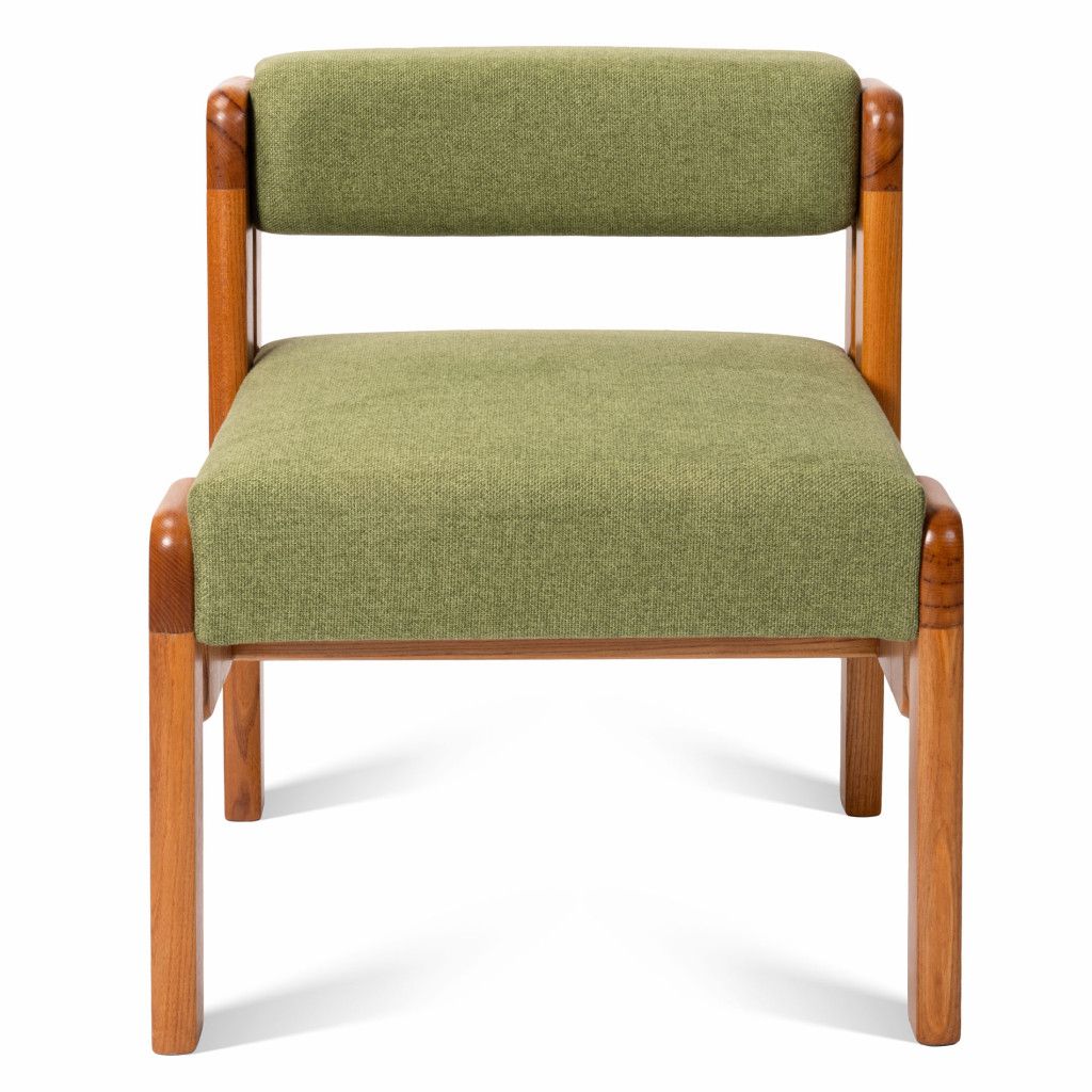Low wooden armchair with an interesting geometric design, made from solid ash. The wood is stained a light brown shade with a matte finish. The seat and backrest have been reupholstered in pea green fabric. The armchair is in great condition after a complete renovation in our workshop. It forms a pair with a matching coffee table, which you can also find in our selection.