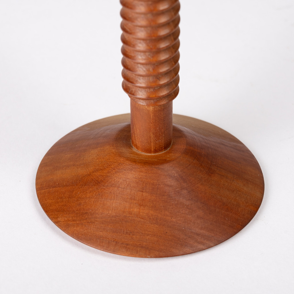 This is a wooden candlestick made by the artist Antonín Hepnar using a lathe. There is a nail at the top to hold the candle in place.