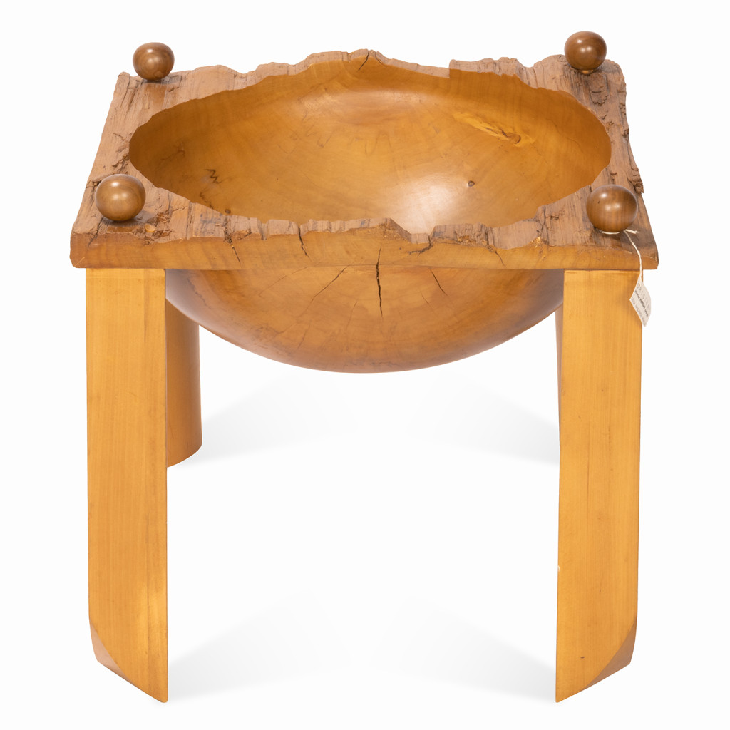 The wooden table consists of a bowl hollowed out of honey-colored linden wood and four short triangular legs with cut tips. The table is based on the contrast between raw and processed material. The edges of the tabletop are intentionally left unfinished and complemented by four turned balls in the corners. The bottom of the bowl hides a beautiful wood grain.